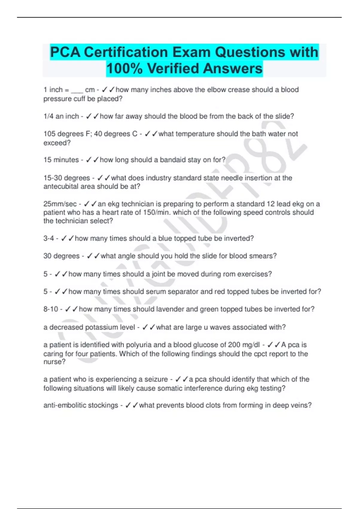 PCA Certification Exam Questions with 100% Verified Answers 1 inch = ___ cm - how many inches above the elbow crease should a blood pressure cuff be placed? 1/4 an inch - how far away should the blood be from the back of the slide? 105 degrees F; 40 degrees C - what temperature should the bath water not exceed? 15 minutes - how long should a bandaid stay on for? 15-30 degrees - what does industry standard state needle insertion at the antecubital area should be at? 25mm/sec - an ekg technician is preparing to perform a standard 12 lead ekg on a patient who has a heart rate of 150/min. which of the following speed controls should the technician select? 3-4 - how many times should a blue topped tube be inverted? 30 degrees - what angle should you hold the slide for blood smears? 5 - how many times should a joint be moved during rom exercises? 5 - how many times should serum separator and red topped tubes be inverted for? 8-10 - how many times should lavender and green topped tubes be inverted for? a decreased potassium level - what are large u waves associated with? a patient is identified with polyuria and a blood glucose of 200 mg/dl - A pca is caring for four patients. Which of the following findings should the cpct report to the nurse? a patient who is experiencing a seizure - a pca should identify that which of the following situations will likely cause somatic interference during ekg testing? anti-embolitic stockings - what prevents blood clots from forming in deep veins?