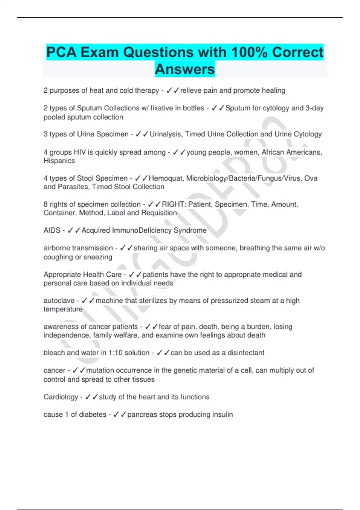 PCA Exam Questions with 100% Correct Answers 2 purposes of heat and cold therapy - relieve pain and promote healing 2 types of Sputum Collections w/ fixative in bottles - Sputum for cytology and 3-day pooled sputum collection 3 types of Urine Specimen - Urinalysis, Timed Urine Collection and Urine Cytology 4 groups HIV is quickly spread among - young people, women, African Americans, Hispanics 4 types of Stool Specimen - Hemoquat, Microbiology/Bacteria/Fungus/Virus, Ova and Parasites, Timed Stool Collection 8 rights of specimen collection - RIGHT: Patient, Specimen, Time, Amount, Container, Method, Label and Requisition AIDS - Acquired ImmunoDeficiency Syndrome airborne transmission - sharing air space with someone, breathing the same air w/o coughing or sneezing Appropriate Health Care - patients have the right to appropriate medical and personal care based on individual needs autoclave - machine that sterilizes by means of pressurized steam at a high temperature awareness of cancer patients - fear of pain, death, being a burden, losing independence, family welfare, and examine own feelings about death bleach and water in 1:10 solution - can be used as a disinfectant cancer - mutation occurrence in the genetic material of a cell, can multiply out of control and spread to other tissues Cardiology - study of the heart and its functions cause 1 of diabetes - pancreas stops producing insulin cause 2 of diabetes - isn't enough insulin produced cause 3 of diabetes - viral trigger that damages insulin cells cause 4 of diabetes - obesity: fat cells larger making it difficult for insulin to enter the cells cause 5 of diabetes - medications, pregnancy, surgery