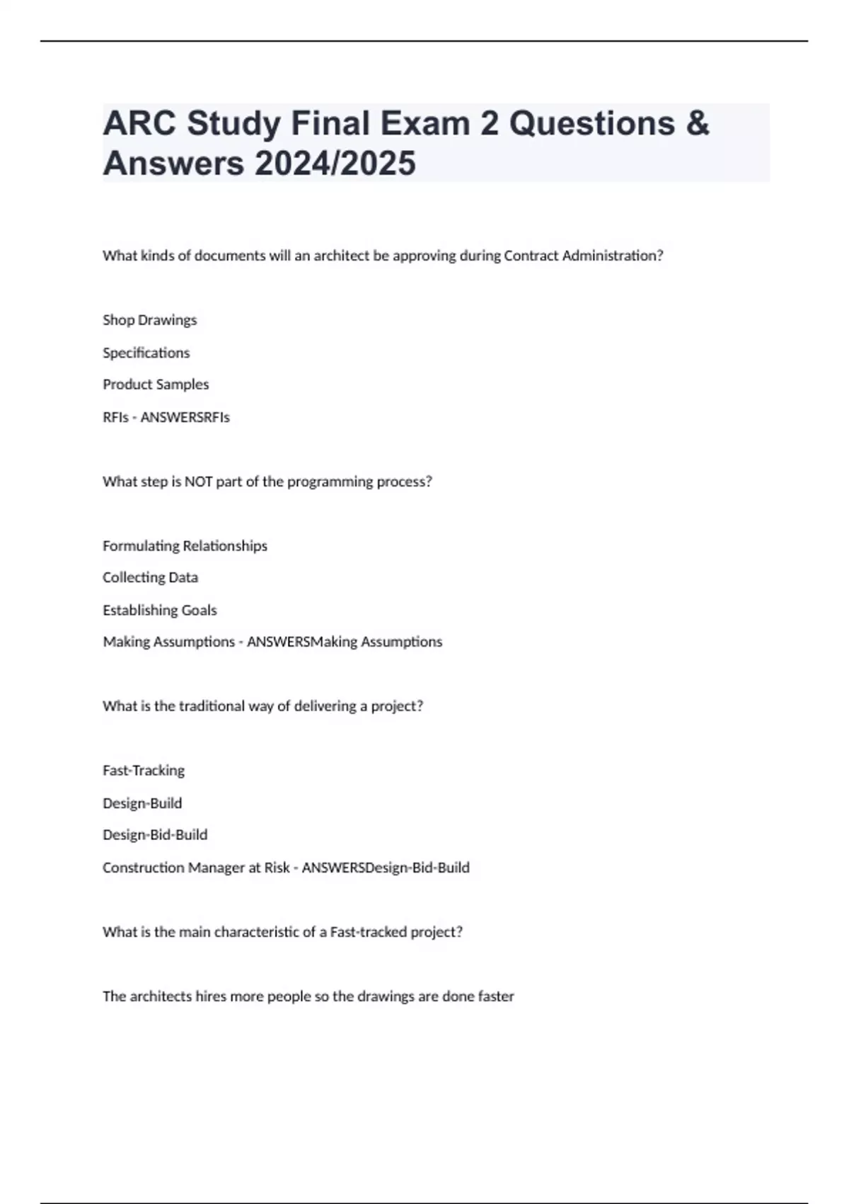 ARC Study Final Exam 2 Questions & Answers 2024/2025 What kinds of documents will an architect be approving during Contract Administration? Shop Drawings Specifications Product Samples RFIs - ANSWERSRFIs What step is NOT part of the programming process? Formulating Relationships Collecting Data Establishing Goals Making Assumptions - ANSWERSMaking Assumptions What is the traditional way of delivering a project? Fast-Tracking Design-Build Design-Bid-Build Construction Manager at Risk - ANSWERSDesign-Bid-Build What is the main characteristic of a Fast-tracked project? The architects hires more people so the drawings are done faster