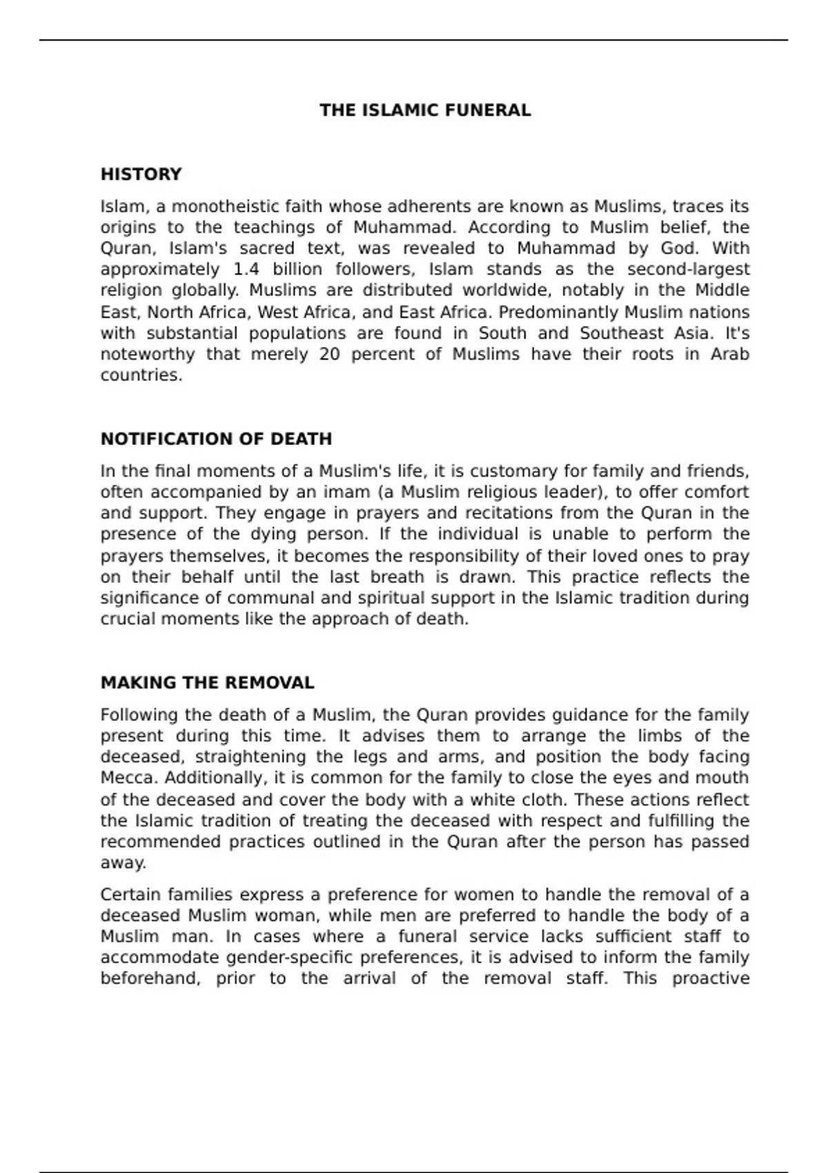 **Explore the Rich Tapestry of the Islamic Funeral Rituals** Delve into the profound and diverse world of funeral rituals with this brief and meticulously crafted summary. This offers a brief dive into the customs, traditions, and historical evolution of certain funeral practices. Whether you're a student of anthropology, sociology, religious studies, Mortuary Sciences or simply curious about the human experience of death and mourning, this summary is your gateway to understanding: **Historical Perspectives:** Trace the origins of funeral rituals to contemporary practices, examining how beliefs and customs have shaped funeral rituals on these religions. **Notification and Mourning:** Explore the delicate art of notifying loved ones and the funeral home of a death, the cultural nuances of mourning periods, and the psychological significance of these rituals in coping with loss. **Visitation and Memorial Services:** Gain insights into the role of visitations and memorial services in different cultures and religions, their symbolic meanings. **Removal and Burial Customs:** Understand the solemn process of preparing and removing the deceased, burial rites, cremation practices, and other considerations of some funeral practices. **Visitation and Funeral Service:** Examine current trends in these funeral rites, including burials, memorials, and multicultural adaptations, reflecting evolving attitudes towards death and commemoration. Enriched with a mortician's insight, this brief summary equips you with an understanding of how human societies and certain religions confront mortality and celebrate life through diverse funeral rituals. Perfect for students, and anyone intrigued by the intersection of culture, tradition, and the human experience. --- This brief summary of the Islamic funeral rites promises to be a good starting point for anyone seeking to explore the profound and aspects of funeral rituals across certain cultures and/or religious beliefs.