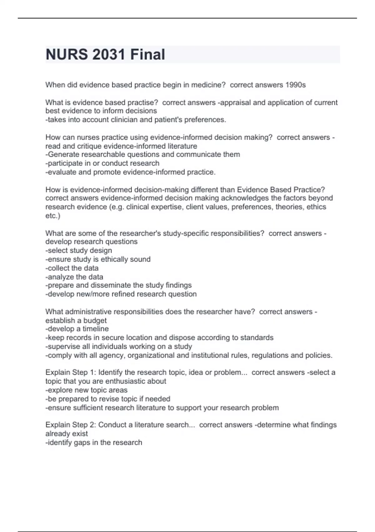 When did evidence based practice begin in medicine? correct answers 1990s What is evidence based practise? correct answers -appraisal and application of current best evidence to inform decisions -takes into account clinician and patient's preferences. How can nurses practice using evidence-informed decision making? correct answers -read and critique evidence-informed literature -Generate researchable questions and communicate them -participate in or conduct research -evaluate and promote evidence-informed practice. How is evidence-informed decision-making different than Evidence Based Practice? correct answers evidence-informed decision making acknowledges the factors beyond research evidence (e.g. clinical expertise, client values, preferences, theories, ethics etc.) What are some of the researcher's study-specific responsibilities? correct answers -develop research questions -select study design -ensure study is ethically sound -collect the data -analyze the data -prepare and disseminate the study findings -develop new/more refined research question What administrative responsibilities does the researcher have? correct answers -establish a budget -develop a timeline -keep records in secure location and dispose according to standards -supervise all individuals working on a study -comply with all agency, organizational and institutional rules, regulations and policies. Explain Step 1: Identify the research topic, idea or problem... correct answers -select a topic that you are enthusiastic about -explore new topic areas -be prepared to revise topic if needed -ensure sufficient research literature to support your research problem Explain Step 2: Conduct a literature search... correct answers -determine what findings already exist -identify gaps in the research