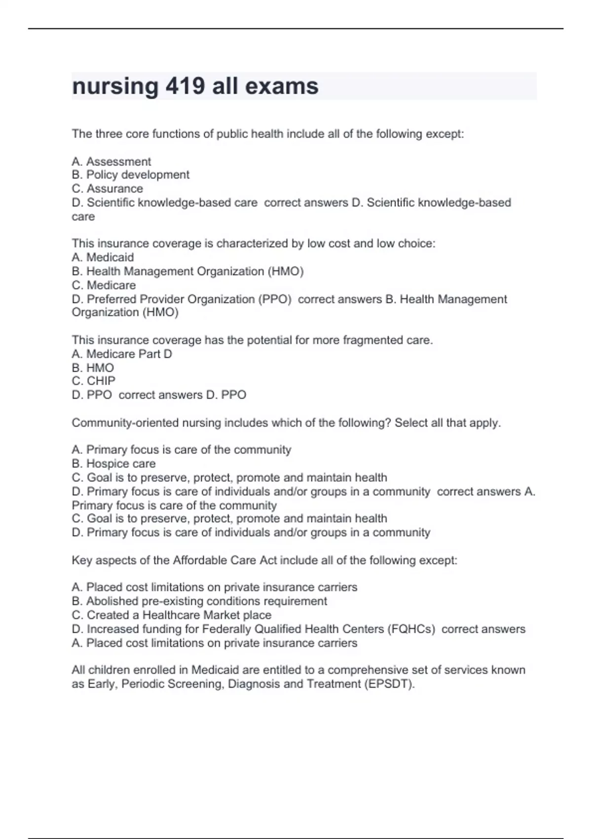 The three core functions of public health include all of the following except: A. Assessment B. Policy development C. Assurance D. Scientific knowledge-based care correct answers D. Scientific knowledge-based care This insurance coverage is characterized by low cost and low choice: A. Medicaid B. Health Management Organization (HMO) C. Medicare D. Preferred Provider Organization (PPO) correct answers B. Health Management Organization (HMO) This insurance coverage has the potential for more fragmented care. A. Medicare Part D B. HMO C. CHIP D. PPO correct answers D. PPO Community-oriented nursing includes which of the following? Select all that apply. A. Primary focus is care of the community B. Hospice care C. Goal is to preserve, protect, promote and maintain health D. Primary focus is care of individuals and/or groups in a community correct answers A. Primary focus is care of the community C. Goal is to preserve, protect, promote and maintain health D. Primary focus is care of individuals and/or groups in a community Key aspects of the Affordable Care Act include all of the following except: A. Placed cost limitations on private insurance carriers B. Abolished pre-existing conditions requirement C. Created a Healthcare Market place D. Increased funding for Federally Qualified Health Centers (FQHCs) correct answers A. Placed cost limitations on private insurance carriers All children enrolled in Medicaid are entitled to a comprehensive set of services known as Early, Periodic Screening, Diagnosis and Treatment (EPSDT). True