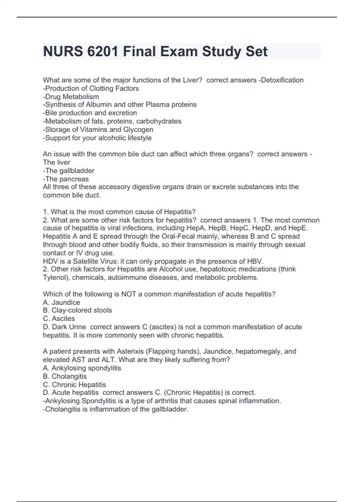 What are some of the major functions of the Liver? correct answers -Detoxification -Production of Clotting Factors -Drug Metabolism -Synthesis of Albumin and other Plasma proteins -Bile production and excretion -Metabolism of fats, proteins, carbohydrates -Storage of Vitamins and Glycogen -Support for your alcoholic lifestyle An issue with the common bile duct can affect which three organs? correct answers -The liver -The gallbladder -The pancreas All three of these accessory digestive organs drain or excrete substances into the common bile duct. 1. What is the most common cause of Hepatitis? 2. What are some other risk factors for hepatitis? correct answers 1. The most common cause of hepatitis is viral infections, including HepA, HepB, HepC, HepD, and HepE. Hepatitis A and E spread through the Oral-Fecal mainly, whereas B and C spread through blood and other bodily fluids, so their transmission is mainly through sexual contact or IV drug use. HDV is a Satellite Virus: it can only propagate in the presence of HBV. 2. Other risk factors for Hepatitis are Alcohol use, hepatotoxic medications (think Tylenol), chemicals, autoimmune diseases, and metabolic problems. Which of the following is NOT a common manifestation of acute hepatitis? A. Jaundice B. Clay-colored stools C. Ascites D. Dark Urine correct answers C (ascites) is not a common manifestation of acute hepatitis. It is more commonly seen with chronic hepatitis. A patient presents with Asterixis (Flapping hands), Jaundice, hepatomegaly, and elevated AST and ALT. What are they likely suffering from? A. Ankylosing spondylitis B. Cholangitis C. Chronic Hepatitis D. Acute hepatitis correct answers C. (Chronic Hepatitis) is correct. -Ankylosing Spondylitis is a type of arthritis that causes spinal inflammation. -Cholangitis is inflammation of the gallbladder.