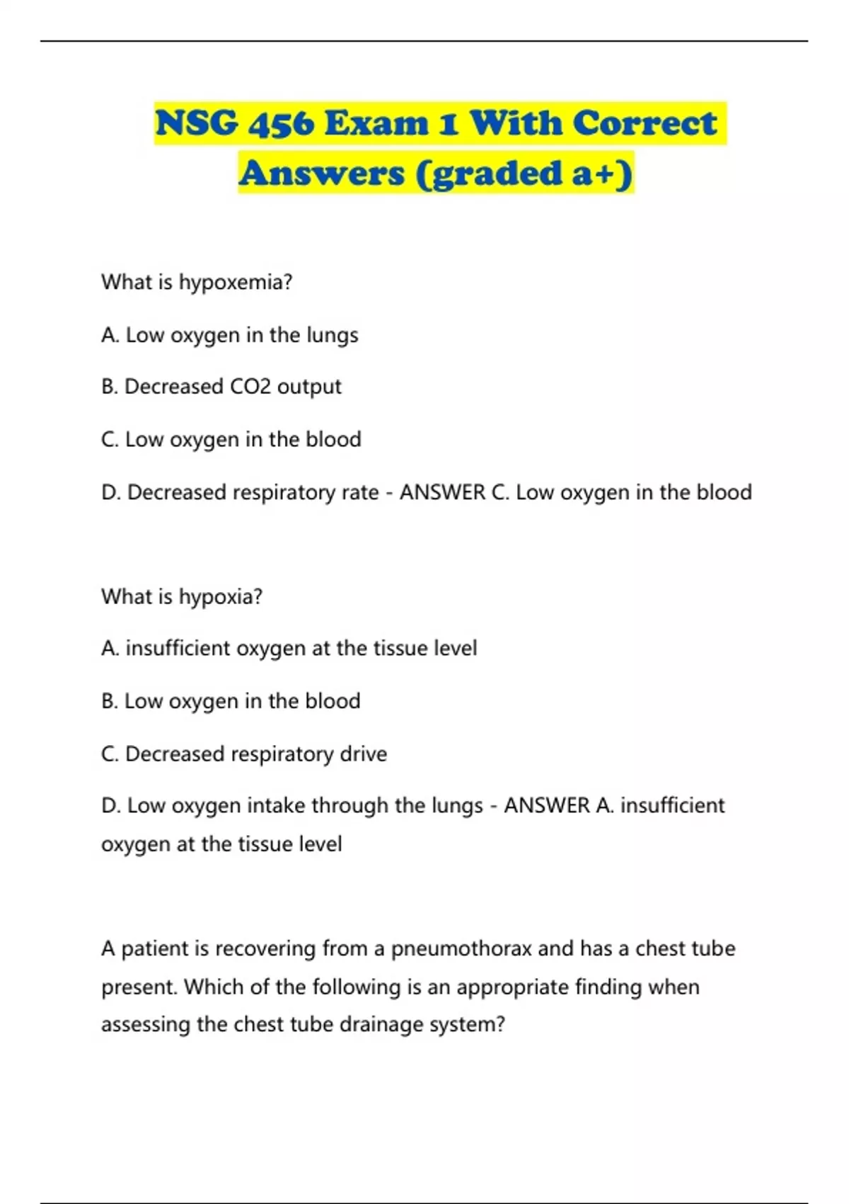 NSG 456 Exam 1 With Correct Answers (graded a+) What is hypoxemia? A. Low oxygen in the lungs B. Decreased CO2 output C. Low oxygen in the blood D. Decreased respiratory rate - ANSWER C. Low oxygen in the blood What is hypoxia? A. insufficient oxygen at the tissue level B. Low oxygen in the blood C. Decreased respiratory drive D. Low oxygen intake through the lungs - ANSWER A. insufficient oxygen at the tissue level A patient is recovering from a pneumothorax and has a chest tub e present. Which of the following is an appropriate finding when assessing the chest tube drainage system? A. Intermittent bubbling may be noted in the water seal chamber. B. 200 cc of drainage per hour is expected during recovery of a pneumothorax. C. The chest tube is positioned at the patient's chest level to facilitate drainage. D. All of these options are appropriate findings. - ANSWER A. Intermittent bubbling may be noted in the water seal chamber. You're assessing a patient who is post-opt from a chest tube insertion. On assessment, you note there is 50 cc of serosanguinous fluid in the drainage chamber, fluctuation of water in the water seal chamber when the patient breathes in and out, and bubbling in the suction control chamber. Which of the following is the most appropriate nursing intervention? A. Document your findings as normal. B. Assess for an air leak due to bubbling noted in the suction chamber. C. Notify the physician about the drainage. D. Milk the tubing to ensure patency of the tubes. - ANSWER A. Document your findings as normal. The patient in room 2569 calls on the call light to tell you something is wrong with his chest tube. When you arrive to the room you note that the drainage system has fallen on its side and is leaking drainage onto the floor from a crack in the system. What is your next PRIORITY? A. Place the patient in supine position and clamp the tubing. B. Notify the physician immediately. C. Disconnect the drainage system and get a new one. D. Disconnect the tubing from the drainage system and insert the tubing 1 inch into a bottle of sterile water and obtain a new system. - ANSWER D. Disconnect the tubing from the drainage system and insert the tubing 1 inch into a bottle of sterile water and obtain a new system. You are providing care to a patient with a chest tube. On assessment of the drainage system, you note continuous bubbling in the water seal chamber and oscillation. Which of the following is the CORRECT nursing intervention for this type of finding? A. Reposition the patient because the tubing is kinked. B. Continue to monitor the drainage system. C. Increase the suction to the drainage system until the bubbling
