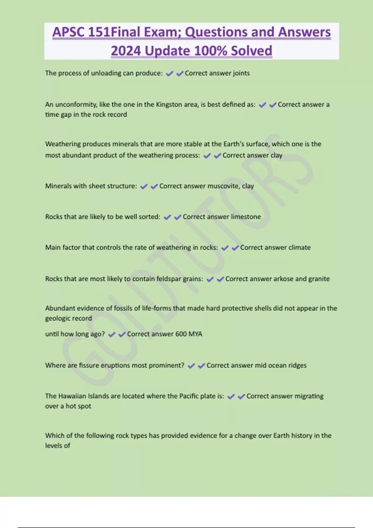 APSC 151Final Exam; Questions and Answers 2024 Update 100% Solved The process of unloading can produce: Correct answer joints An unconformity, like the one in the Kingston area, is best defined as: Correct answer a time gap in the rock record Weathering produces minerals that are more stable at the Earth's surface, which one is the most abundant product of the weathering process: Correct answer clay Minerals with sheet structure: Correct answer muscovite, clay Rocks that are likely to be well sorted: Correct answer limestone