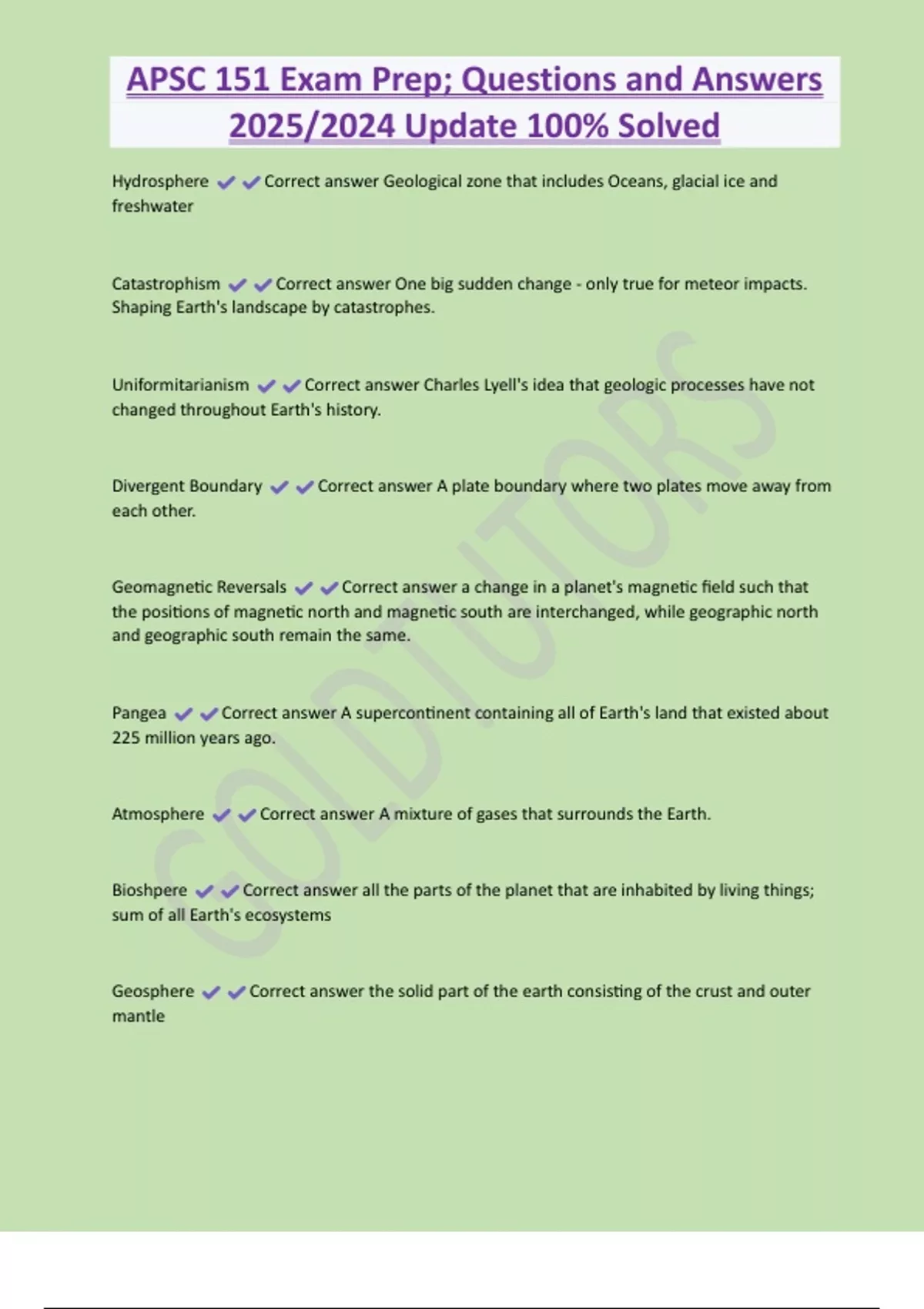 APSC 151 Exam Prep; Questions and Answers 2025/2024 Update 100% Solved Hydrosphere Correct answer Geological zone that includes Oceans, glacial ice and freshwater Catastrophism Correct answer One big sudden change - only true for meteor impacts. Shaping Earth's landscape by catastrophes. Uniformitarianism Correct answer Charles Lyell's idea that geologic processes have not changed throughout Earth's history. Divergent Boundary Correct answer A plate boundary where two plates move away from each othe