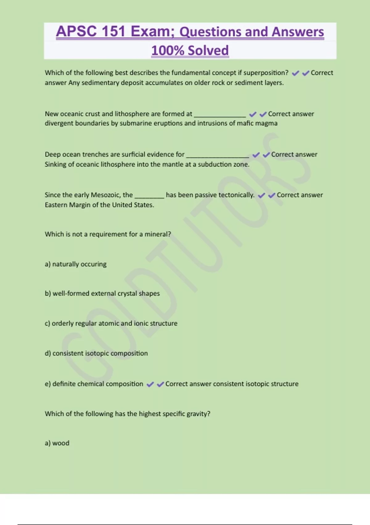APSC 151 Exam; Questions and Answers 100% Solved Which of the following best describes the fundamental concept if superposition? Correct answer Any sedimentary deposit accumulates on older rock or sediment layers. New oceanic crust and lithosphere are formed at ______________ Correct answer divergent boundaries by submarine eruptions and intrusions of mafic magma