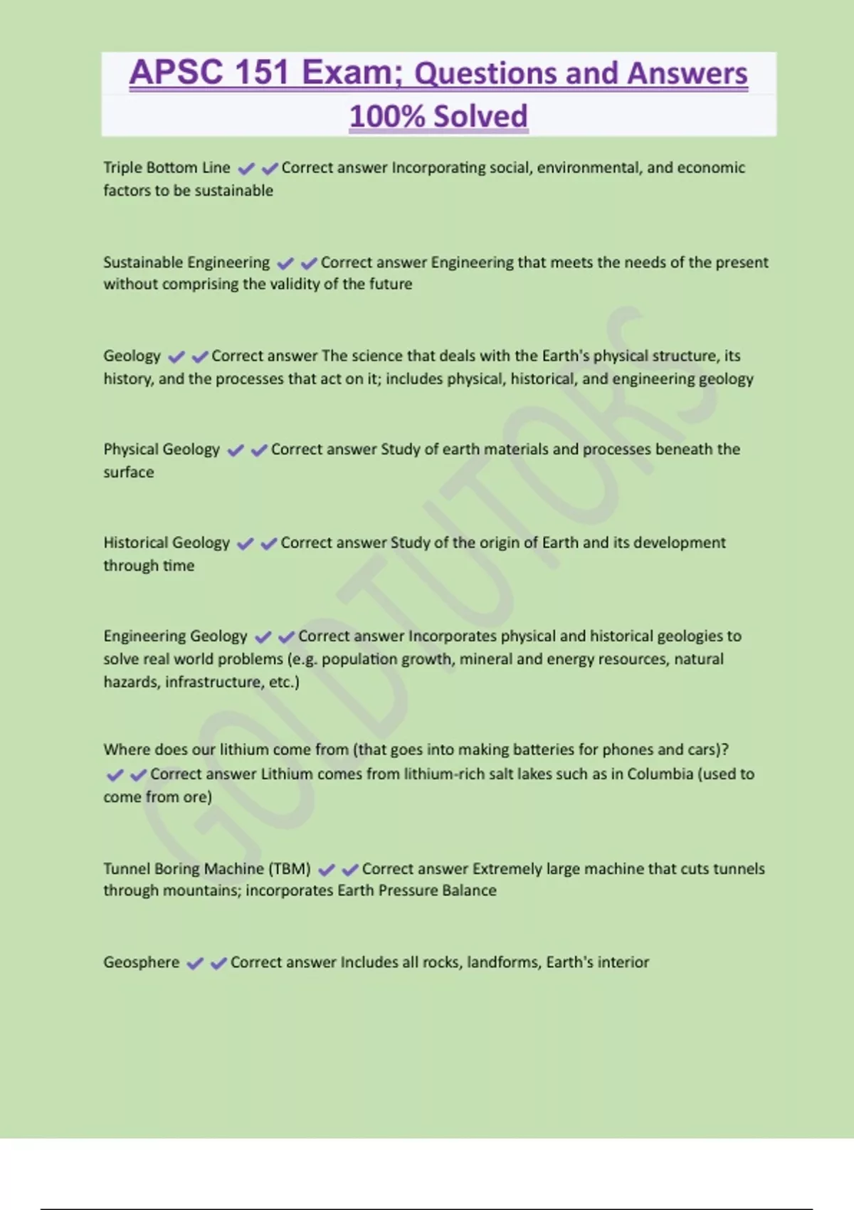 APSC 151 Exam; Questions and Answers 100% Solved Triple Bottom Line Correct answer Incorporating social, environmental, and economic factors to be sustainable Sustainable Engineering Correct answer Engineering that meets the needs of the present without comprising the validity of the future Geology Correct answer The science that deals with the Earth's physical structure, its history, and the processes that act on it; includes physical, historical, and engineering geology Physical Geology Correct answer Study of earth materials and processes beneath the surface Historical Geology Correct answer Study of the origin of Earth and its development through time