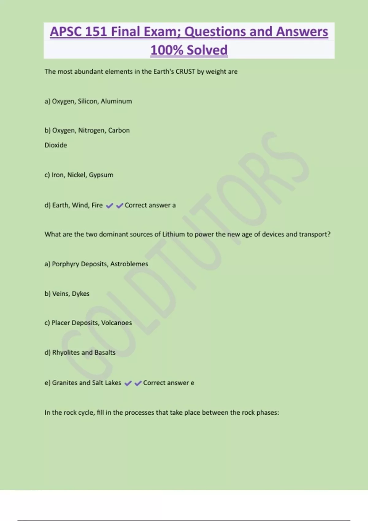 APSC 151 Final Exam; Questions and Answers 100% Solved The most abundant elements in the Earth's CRUST by weight are a) Oxygen, Silicon, Aluminum b) Oxygen, Nitrogen, Carbon Dioxide c) Iron, Nickel, Gypsum d) Earth, Wind, Fire Correct answer a What are the two dominant sources of Lithium to power the new age of devices and transport? a) Porphyry Deposits, Astroblemes b) Veins, Dykes c) Placer Deposits, Volcanoes d) Rhyolites and Basalts