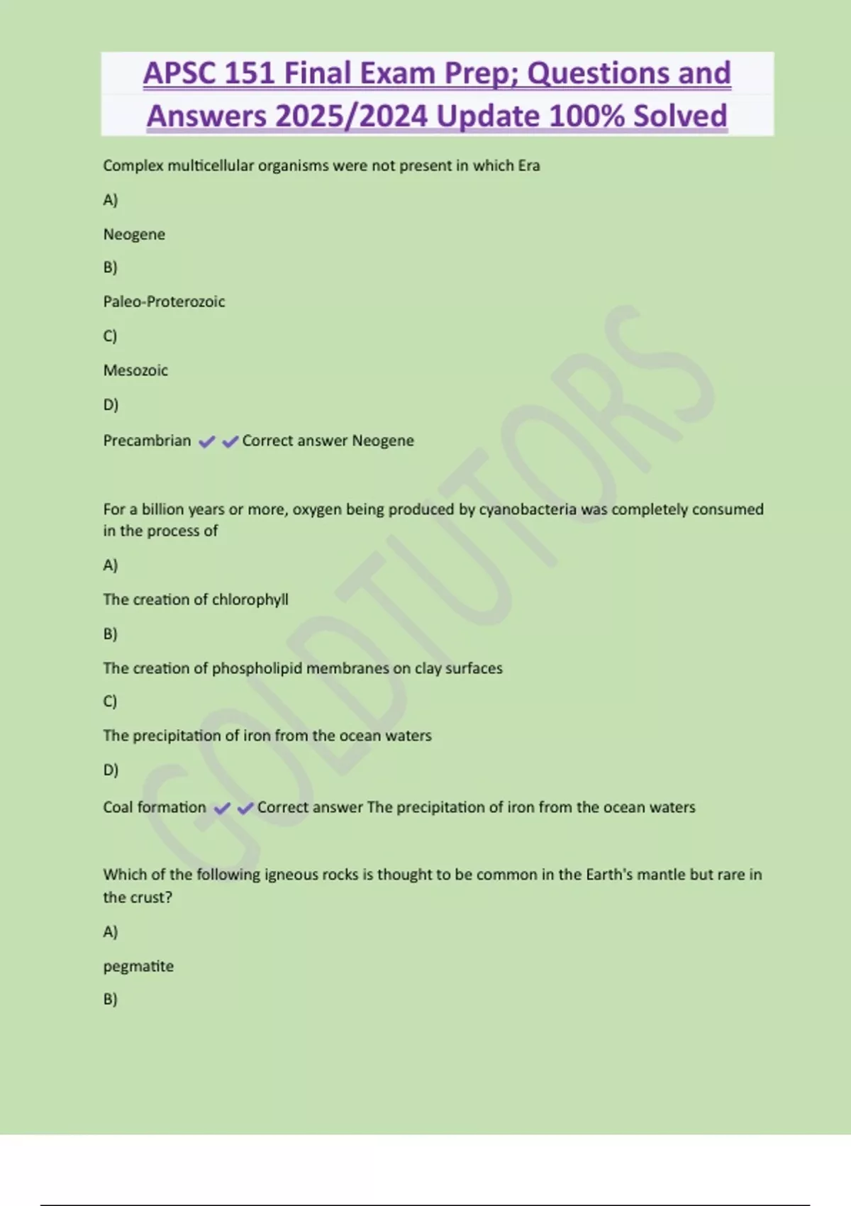 APSC 151 Final Exam Prep; Questions and Answers 2025/2024 Update 100% Solved Complex multicellular organisms were not present in which Era A) Neogene B) Paleo-Proterozoic C) Mesozoic D) Precambrian Correct answer Neogene For a billion years or more, oxygen being produced by cyanobacteria was completely consumed in the process of A) The creation of chlorophyll B) The creation of phospholipid membranes on clay surfaces C) The precipitation of iron from the ocean waters D) Coal formation Correct answer The precipitation of iron from the ocean waters