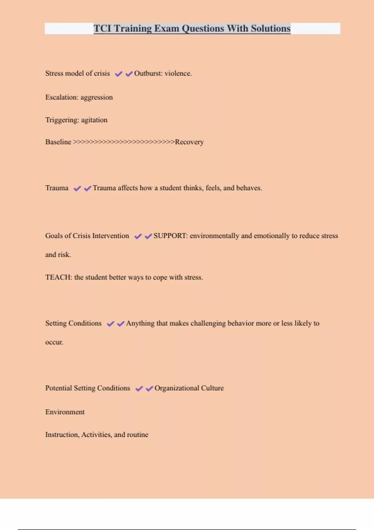 TCI Training Exam Questions With Solutions Stress model of crisis Outburst: violence. Escalation: aggression Triggering: agitation Baseline Recovery Trauma Trauma affects how a student thinks, feels, and behaves. Goals of Crisis Intervention SUPPORT: environmentally and emotionally to reduce stress and risk. TEACH: the student better ways to cope with stress.