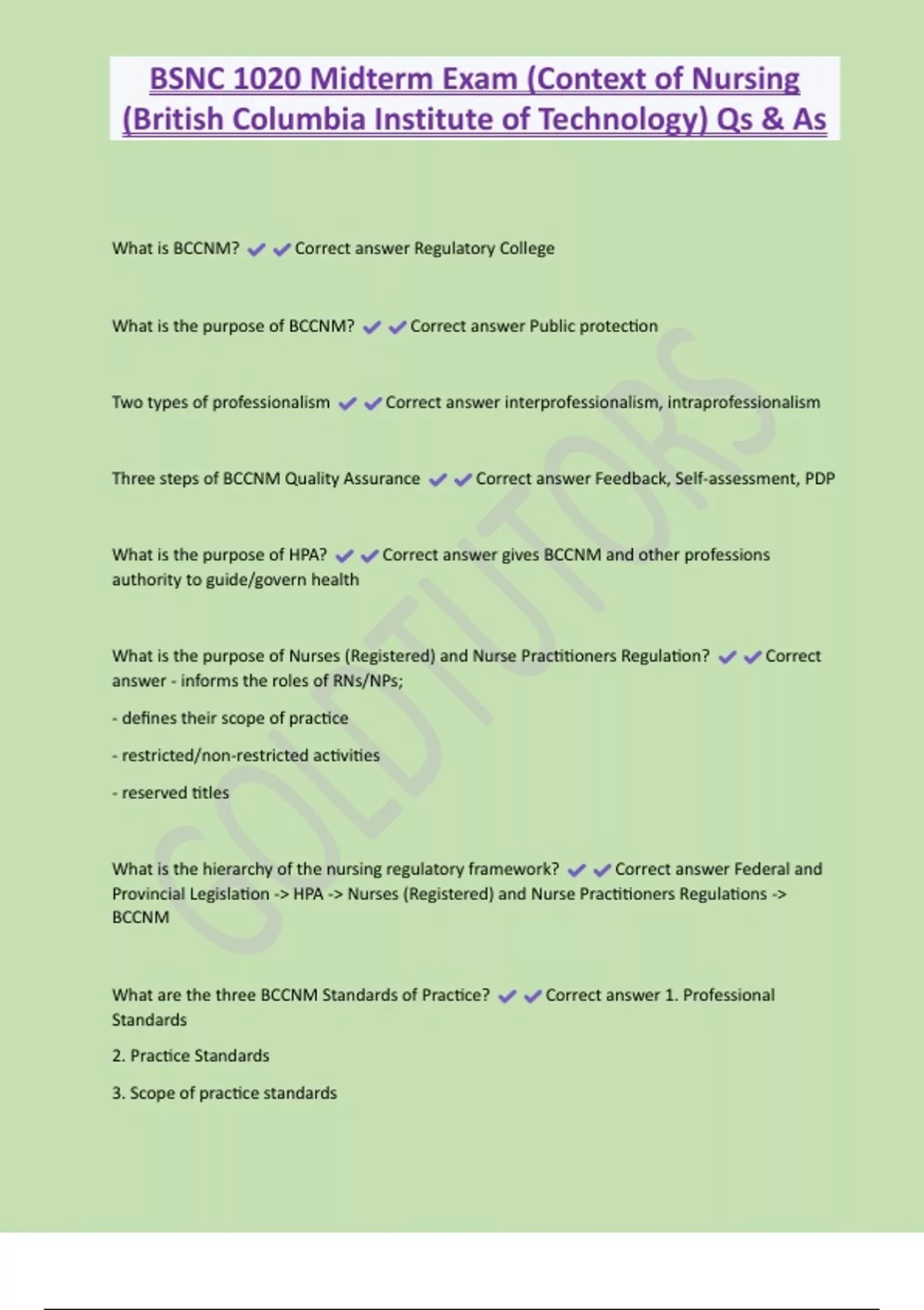 BSNC 1020 Midterm Exam (Context of Nursing (British Columbia Institute of Technology) Qs & As What is BCCNM? Correct answer Regulatory College What is the purpose of BCCNM? Correct answer Public protection Two types of professionalism Correct answer interprofessionalism, intraprofessionalism Three steps of BCCNM Quality Assurance Correct answer Feedback, Self-assessment, PDP What is the purpose of HPA? Correct answer gives BCCNM and other professions authority to guide/govern health