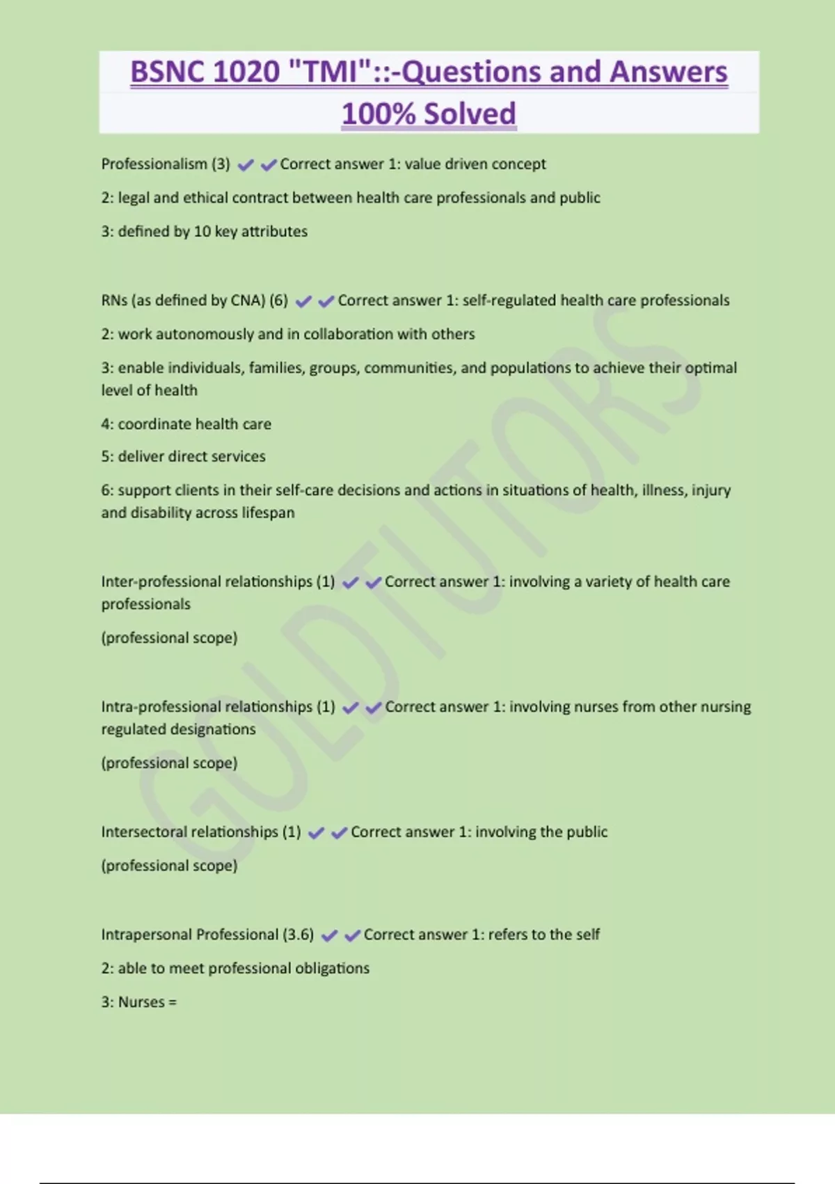 BSNC 1020 "TMI"::-Questions and Answers 100% Solved Professionalism (3) Correct answer 1: value driven concept 2: legal and ethical contract between health care professionals and public 3: defined by 10 key attributes RNs (as defined by CNA) (6) Correct answer 1: self-regulated health care professionals 2: work autonomously and in collaboration with others 3: enable individuals, families, groups, communities, and populations to achieve their optimal level of health 4: coordinate health care 5: deliver direct services 6: support clients in their self-care decisions and actions in situations of health, illness, injury and disability across lifespan
