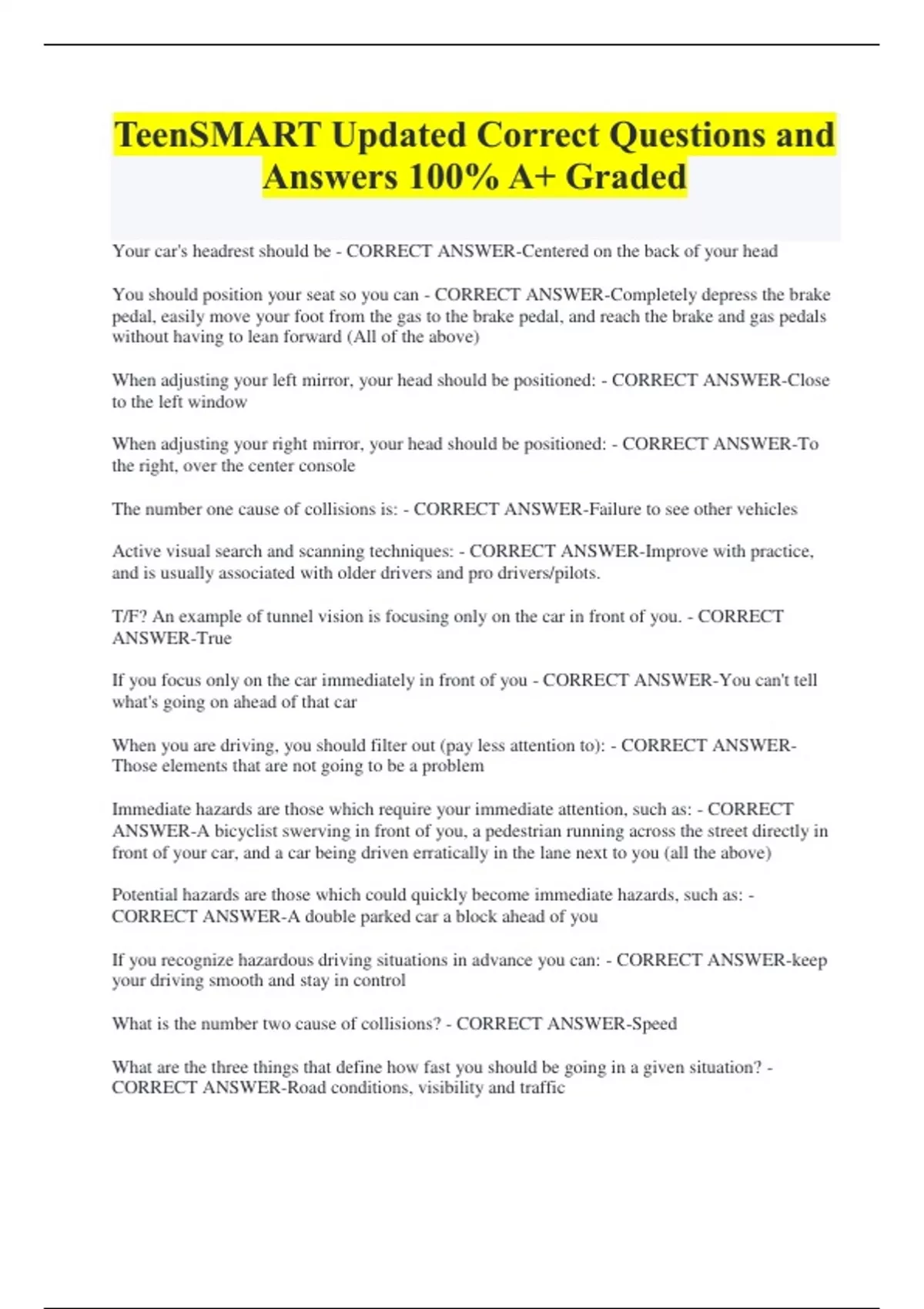 TeenSMART Updated Correct Questions and Answers 100% A+ Graded Your car's headrest should be - CORRECT ANSWER-Centered on the back of your head You should position your seat so you can - CORRECT ANSWER-Completely depress the brake pedal, easily move your foot from the gas to the brake pedal, and reach the brake and gas pedals without having to lean forward (All of the above) When adjusting your left mirror, your head should be positioned: - CORRECT ANSWER-Close to the left window When adjusting your right mirror, your head should be positioned: - CORRECT ANSWER-To the right, over the center console The number one cause of collisions is: - CORRECT ANSWER-Failure to see other vehicles Active visual search and scanning techniques: - CORRECT ANSWER-Improve with practice, and is usually associated with older drivers and pro drivers/pilots. T/F? An example of tunnel vision is focusing only on the car in front of you. - CORRECT ANSWER-True If you focus only on the car immediately in front of you - CORRECT ANSWER-You can't tell what's going on ahead of that car When you are driving, you should filter out (pay less attention to): - CORRECT ANSWER-Those elements that are not going to be a problem Immediate hazards are those which require your immediate attention, such as: - CORRECT ANSWER-A bicyclist swerving in front of you, a pedestrian running across the street directly in front of your car, and a car being driven erratically in the lane next to you (all the above) Potential hazards are those which could quickly become immediate hazards, such as: - CORRECT ANSWER-A double parked car a block ahead of you If you recognize hazardous driving situations in advance you can: - CORRECT ANSWER-keep your driving smooth and stay in control What is the number two cause of collisions? - CORRECT ANSWER-Speed What are the three things that define how fast you should be going in a given situation? - CORRECT ANSWER-Road conditions, visibility and traffic In a 55 MPH zone, when you speed up from 55 to 65 MPH, your chance of getting killed: - CORRECT ANSWER-Doubles If you are driving 30 MPH under ideal conditions and you see a problem, you can stop: - CORRECT ANSWER-In 75 feet The more you drive: - CORRECT ANSWER-The more likely you are to get into a collision because (i can't remember the rest) An example of inherently risky activity is: - CORRECT ANSWER-Driving, snowboarding, and skydiving (all the above) Cumulative risk: - CORRECT ANSWER-Adds up over time as you do something risky again and again, increases your chances of getting into a crash, and needs to be effectively managed (all the above) Why are teen drivers more at risk than older, more experienced drivers? - CORRECT ANSWER-Teens are more apt to fail to see or perceive something as a risk, older drivers have more driving experience, and brain chemistry that controls risk taking tendencies has not fully developed (all the above) When making a lane change in front of a car, where should that car be in your mirrors? - CORRECT ANSWER-Toward the middle of your rearview mirror When you are thinking of changing lanes, what should you do? - CORRECT ANSWER-Signal, check your mirrors, and look over your shoulder (all of the above) True or false? It is safe to merge to the right if you can see a car in your side mirror - CORRECT ANSWER-False Ture or false? Keeping an eye out for gaps in traffic in front and back and in the other lanes, helps you identify possible escape routes - CORRECT ANSWER-True The estimated percentage of rear-end collisions caused by cell phone use or texting is what? - CORRECT ANSWER-60% An example of visual distraction is: - CORRECT ANSWER-Checking the controls on your dash Cognitive distractions - CORRECT ANSWER-Occur when you are thinking about something other than driving, decrease your ability to judge speed and space, and slow down your reaction time (all the above) If you drive with three or more passengers under the age of 21, your crash risk increases by: - CORRECT ANSWER-176%