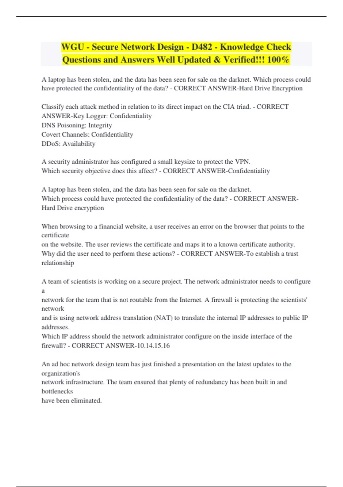 WGU - Secure Network Design - D482 - Knowledge Check Questions and Answers Well Updated & Verified!!! 100%