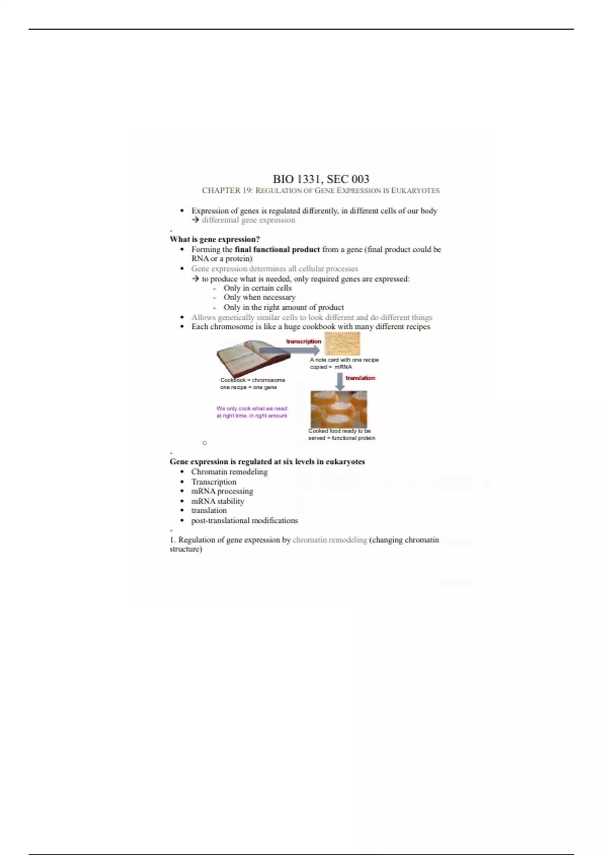 This is a comprehensive and detailed note on regulation for gene expression in eukaryote for Bio 1331. Essential!! To your success in academics!!