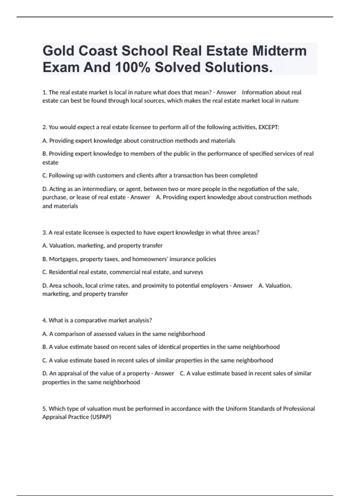 1. The real estate market is local in nature what does that mean? - Answer Information about real estate can best be found through local sources, which makes the real estate market local in nature 2. You would expect a real estate licensee to perform all of the following activities, EXCEPT: A. Providing expert knowledge about construction methods and materials B. Providing expert knowledge to members of the public in the performance of specified services of real estate C. Following up with customers and clients after a transaction has been completed D. Acting as an intermediary, or agent, between two or more people in the negotiation of the sale, purchase, or lease of real estate - Answer A. Providing expert knowledge about construction methods and materials 3. A real estate licensee is expected to have expert knowledge in what three areas? A. Valuation, marketing, and property transfer B. Mortgages, property taxes, and homeowners' insurance policies C. Residential real estate, commercial real estate, and surveys D. Area schools, local crime rates, and proximity to potential employers - Answer A. Valuation, marketing, and property transfer 4. What is a comparative market analysis? A. A comparison of assessed values in the same neighborhood B. A value estimate based on recent sales of identical properties in the same neighborhood C. A value estimate based in recent sales of similar properties in the same neighborhood D. An appraisal of the value of a property - Answer C. A value estimate based in recent sales of similar properties in the same neighborhood 5. Which type of valuation must be performed in accordance with the Uniform Standards of Professional Appraisal Practice (USPAP)