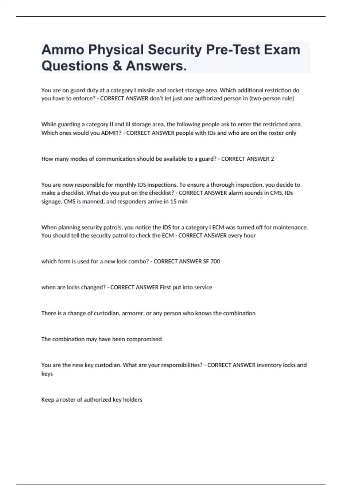 Ammo Physical Security Pre-Test Exam Questions & Answers. You are on guard duty at a category I missile and rocket storage area. Which additional restriction do you have to enforce? - CORRECT ANSWER don't let just one authorized person in (two-person rule) While guarding a category II and III storage area, the following people ask to enter the restricted area. Which ones would you ADMIT? - CORRECT ANSWER people with IDs and who are on the roster only How many modes of communication should be available to a guard? - CORRECT ANSWER 2 You are now responsible for monthly IDS inspections. To ensure a thorough inspection, you decide to make a checklist. What do you put on the checklist? - CORRECT ANSWER alarm sounds in CMS, IDs signage, CMS is manned, and responders arrive in 15 min When planning security patrols, you notice the IDS for a category I ECM was turned off for maintenance. You should tell the security patrol to check the ECM - CORRECT ANSWER every hour which form is used for a new lock combo? - CORRECT ANSWER SF 700 when are locks changed? - CORRECT ANSWER First put into service There is a change of custodian, armorer, or any person who knows the combination The combination may have been compromised You are the new key custodian. What are your responsibilities? - CORRECT ANSWER inventory locks and keys Keep a roster of authorized key holders