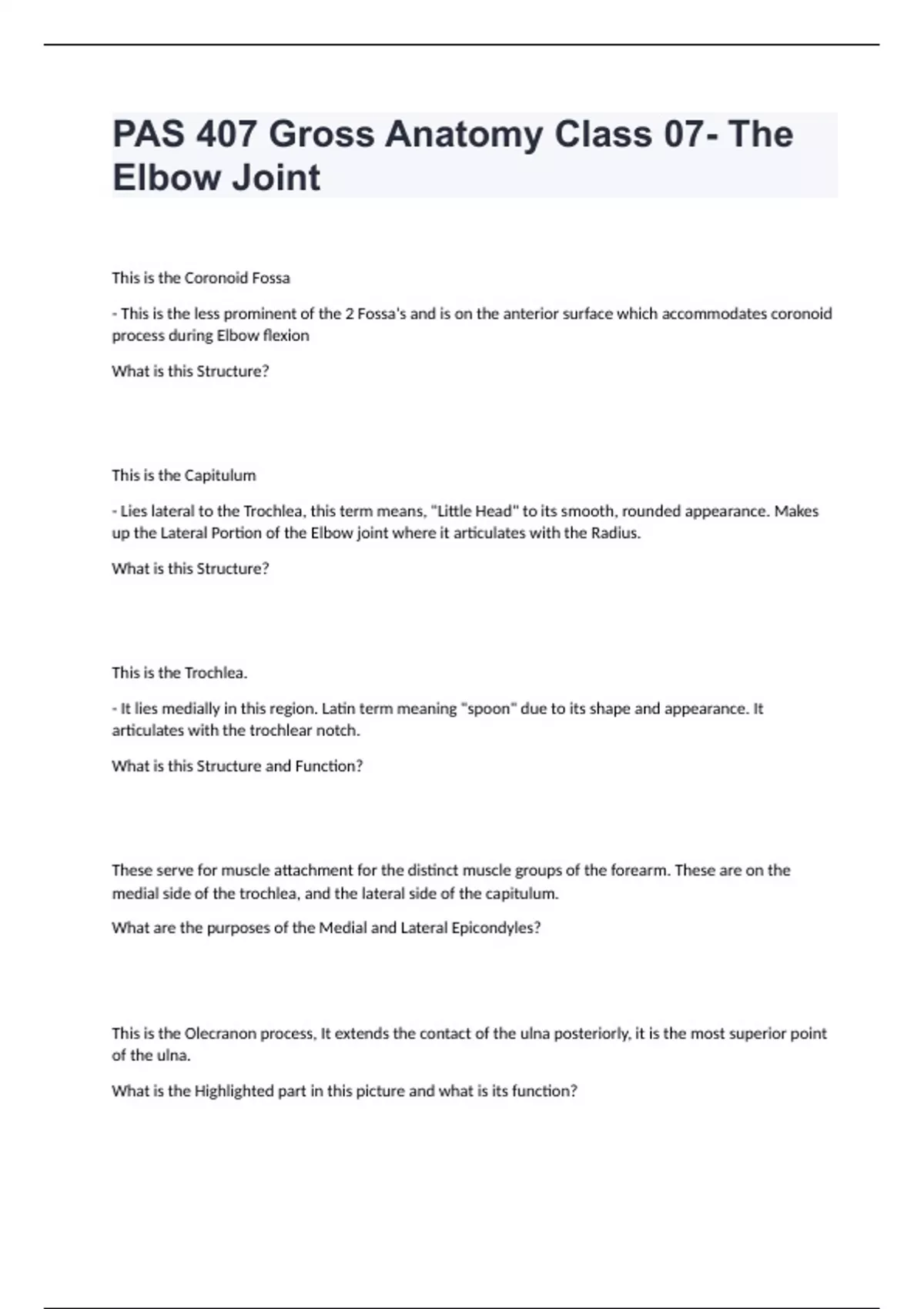 PAS 407 Gross Anatomy Class 07- The Elbow Joint with complete answers