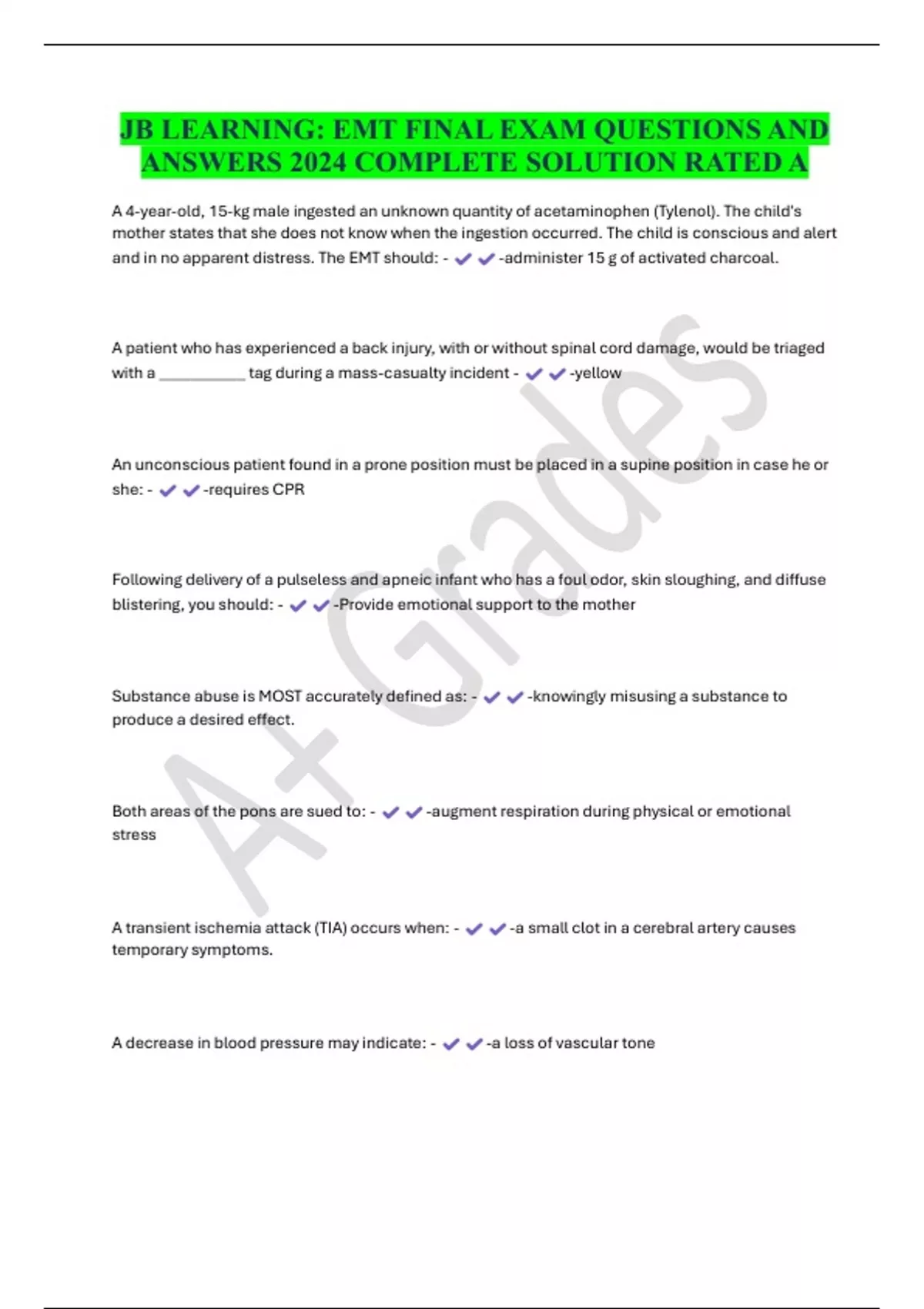 JB LEARNING: EMT FINAL EXAM QUESTIONS AND ANSWERS 2024 COMPLETE SOLUTION RATED A A 4-year-old, 15-kg male ingested an unknown quantity of acetaminophen (Tylenol). The child's mother states that she does not know when the ingestion occurred. The child is conscious and alert and in no apparent distress. The EMT should: - -administer 15 g of activated charcoal. A patient who has experienced a back injury, with or without spinal cord damage, would be triaged with a ___________ tag during a mass-casualty incident - -yellow An unconscious patient found in a prone position must be placed in a supine position in case he or she: - -requires CPR Following delivery of a pulseless and apneic infant who has a foul odor, skin sloughing, and diffuse blistering, you should: - -Provide emotional support to the mother Substance abuse is MOST accurately defined as: - -knowingly misusing a substance to produce a desired effect. Both areas of the pons are sued to: - -augment respiration during physical or emotional stress A transient ischemia attack (TIA) occurs when: - -a small clot in a cerebral artery causes temporary symptoms. A decrease in blood pressure may indicate: - -a loss of vascular tone Ketone production is the result of: - -fat metabolization when glucose is unavailable. A partial-thickness burn involves the outer layer of skin and a portion of the: - -dermal layer A young female experienced a laceration to her left eyeball from flying glass when her boyfriend broke a soda bottle against a wall. There is moderate bleeding and the patient states that she cannot see out of the injured eye. You should: - -avoid applying pressure to the globe when you are covering the eye. At rest, the normal adult heart rate should not exceed: - -100 beats/min Delivering a patient to the hospital involves all of the following activities, EXCEPT: - -giving a verbal report to the clerk Common names for activated charcoal include all of the following, EXCEPT: - -Fructose As the bronchus divides into smaller br