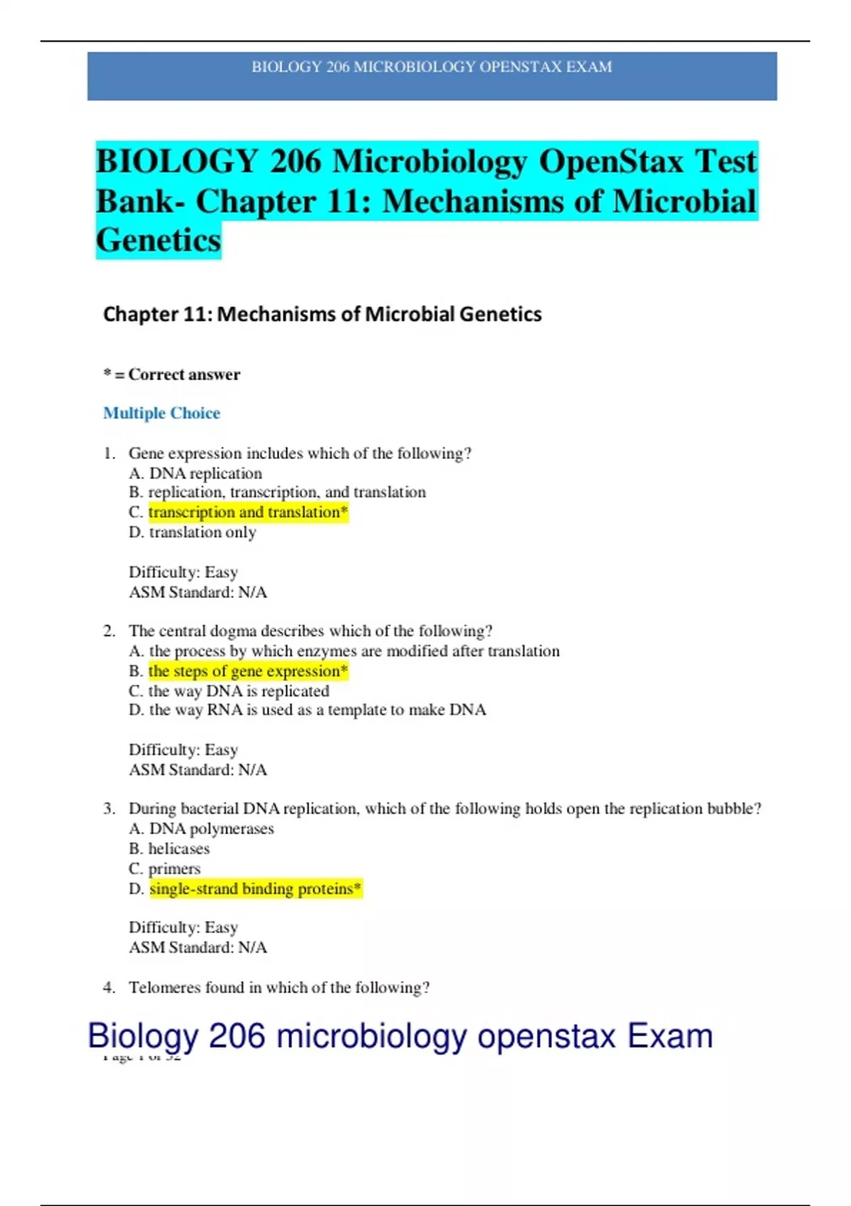 BIOLOGY 206 MICROBIOLOGY OPENSTAX EXAM Page 1 of 32 Biology 206 microbiology openstax Exam BIOLOGY 206 Microbiology OpenStax Test Bank- Chapter 11: Mechanisms of Microbial Genetics Chapter 11: Mechanisms of Microbial Genetics * = Correct answer Multiple Choice 1. Gene expression includes which of the following? A. DNA replication B. replication, transcription, and translation C. transcription and translation* D. translation only Difficulty: Easy ASM Standard: N/A 2. The central dogma describes which of the following? A. the process by which enzymes are modified after translation B. the steps of gene expression* C. the way DNA is replicated D. the way RNA is used as a template to make DNA Difficulty: Easy ASM Standard: N/A 3. During bacterial DNA replication, which of the following holds open the replication bubble? A. DNA polymerases B. helicases C. primers D. single-strand binding proteins* Difficulty: Easy ASM Standard: N/A 4. Telomeres found in which of the following? BIOLOGY 206 MICROBIOLOGY OPENSTAX EXAM Page 2 of 32 Biology 206 microbiology openstax Exam A. all microbes B. animal cells only, not in unicellular organisms C. fungal, protist, plant, and animal chromosomes* BIOLOGY 206 MICROBIOLOGY OPENSTAX EXAM Page 3 of 32 Biology 206 microbiology openstax Exam D. microbes only, including all domains Difficulty: Easy ASM Standard: 16 5. Which of the following best describes the direction in which lagging strands are added? A. as 5′ to 3′ Okazaki fragments in an overall 3′ to 5′ direction only* B. as 5′ to 3′ Okazaki fragments in an overall 5′ to 3′ direction only C. in the 3′ to 5′ or 5′ to 3′ direction BIOLOGY 206 MICROBIOLOGY OPENSTAX EXAM Page 4 of 32 Biology 206 microbiology openstax Exam D. in variable directions depending on the species Difficulty: Easy ASM Standard: N/A 6. Which of the following correctly describes uracil and where is it found? A. It is a nitrogenous base found in DNA and RNA. B. It is a nitrogenous base found in DNA only. C. It is a nitrogenous base found in RNA only.* D. It is a nitrogenous base found only in nucleotides of molecules other than RNA and DNA. Difficulty: Easy ASM Standard: N/A 7. Which of the following is another name for the template strand (the strand of DNA that is transcribed)? A. anticodon strand B. antisense strand* C. sense strand D. transcription strand Difficulty: Moderate ASM Standard: N/A 8. Which of the following correctly describes events that occur during transcription? A. DNA polymerase binds to the site of initiation. B. RNA polymerase binds to the core enzyme. C. RNA polymerase binds to the operator. D. RNA polymerase binds to the promoter.* Difficulty: Easy ASM Standard: N/A 9. Which of the following correctly explains why DNA replication is described as semiconservative? A. Each daughter strand contains one old strand and one new strand.* B. Each daughter strand contains two new strands. C. The nucleotides used in replication are recycled multiple times. D. The nucleotides used in replication contain old and new components. Difficulty: Moderate ASM Standard: N/A 10. During DNA replication in bacteria, which of the following enzymes adds DNA nucleotides to the growing strand? BIOLOGY 206 MICROBIOLOGY OPENSTAX EXAM Page 5 of 32 Biology 206 microbiology openstax Exam A. DNA polymerase I