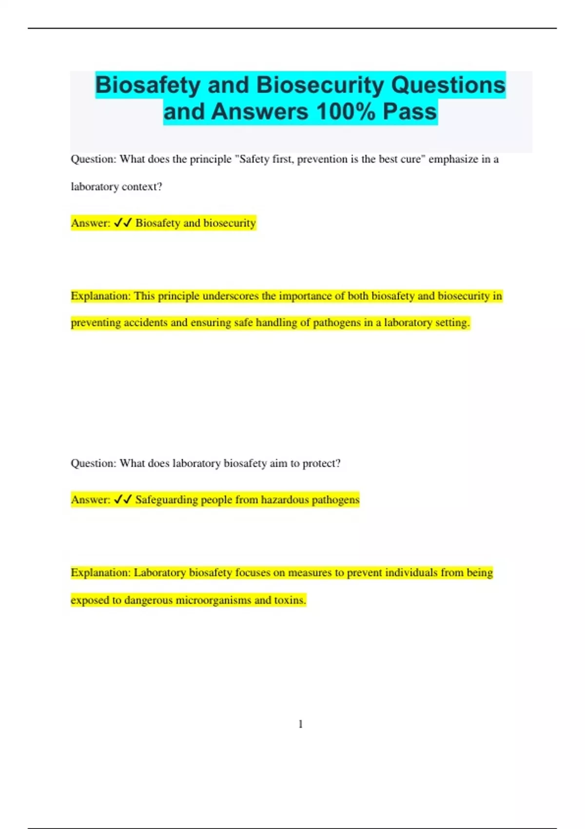 Biosafety and Biosecurity Questions and Answers 100% Pass Question: What does the principle "Safety first, prevention is the best cure" emphasize in a laboratory context? Answer: Biosafety and biosecurity Explanation: This principle underscores the importance of both biosafety and biosecurity in preventing accidents and ensuring safe handling of pathogens in a laboratory setting. Question: What does laboratory biosafety aim to protect? Answer: Safeguarding people from hazardous pathogens Explanation: Laboratory biosafety focuses on measures to prevent individuals from being exposed to dangerous microorganisms and toxins. 2 Question: What is the focus of laboratory biosecurity? Answer: Protecting pathogens from individuals with harmful intentions Explanation: Laboratory biosecurity involves strategies to prevent the theft, loss, or misuse of infectious agents and biological materials. Question: What is the goal of biosafety? Answer: To avert the unintentional release of pathogens and toxins Explanation: Biosafety aims to prevent accidental exposure or dissemination of harmful biological substances. Question: What does biosecurity aim to prevent? 3 Answer: The loss or misuse of pathogens and toxins Explanation: Biosecurity measures ensure that dangerous biological agents are not stolen or used for malicious purposes. Question: What practices are included in biosafety measures? Options: A. Wearing PPE B. Using hazard symbols C. Adhering to protocols and procedures D. Proper disposal of infectious waste E. Using specialized equipment Explanation: Effective biosafety practices encompass wearing appropriate personal protective equipment (PPE), recognizing and following hazard symbols, adhering strictly to protocols, disposing of infectious waste correctly, and utilizing specialized equipment. 4 Question: Why are biosafety practices essential? Answer: To prevent labacquired infections, secondary infections in the general population, and environmental contamination Explanation: Biosafety practices are crucial for minimizing the risk of infections within the lab, protecting the wider community, and preventing environmental contamination. Question: What are the top four accidents leading