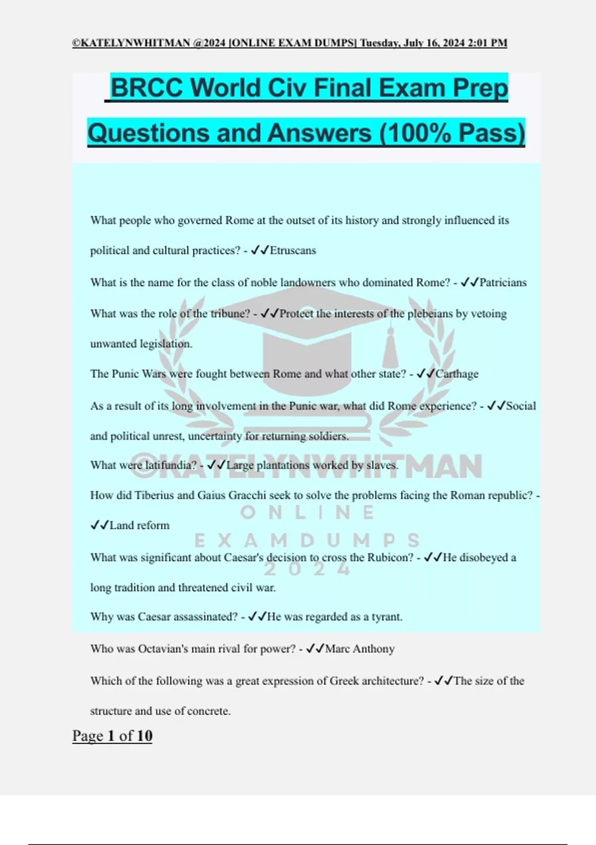 BRCC World Civ Final Exam Prep Questions and Answers (100% Pass)