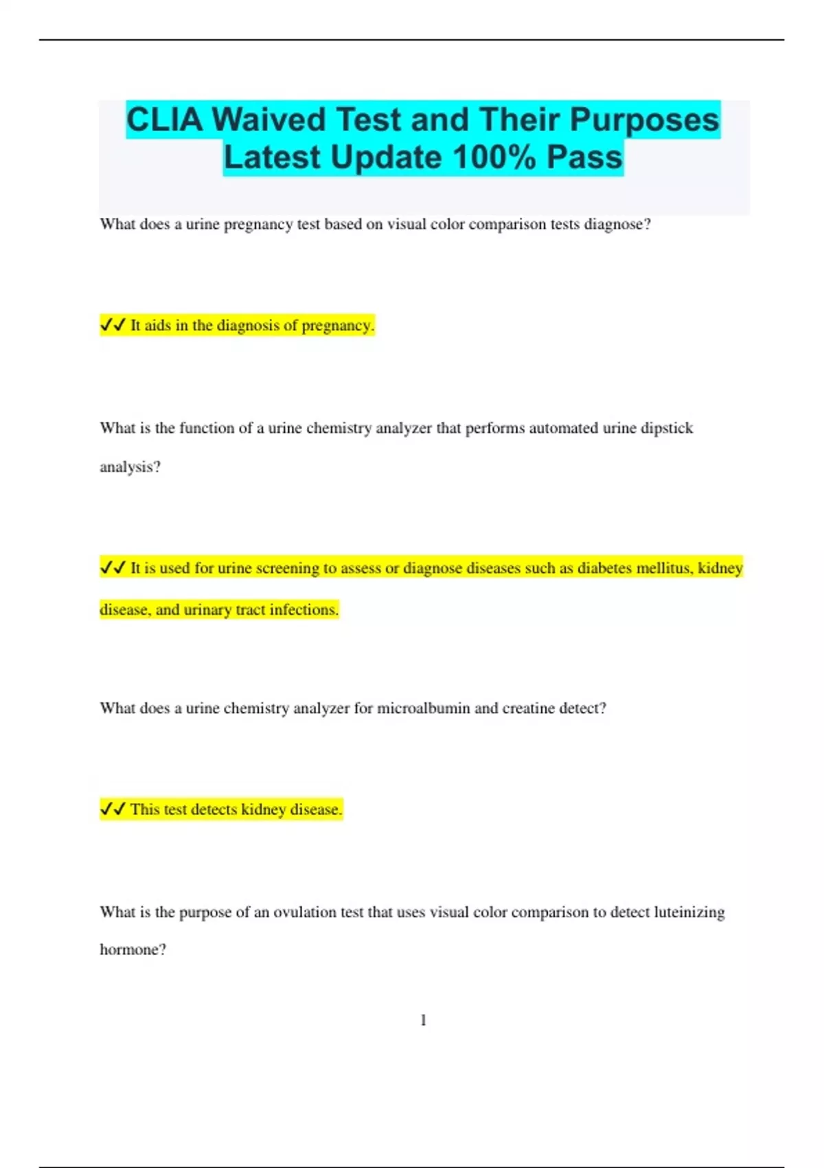 CLIA Waived Test and Their Purposes Latest Update 100% Pass What does a urine pregnancy test based on visual color comparison tests diagnose? It aids in the diagnosis of pregnancy. What is the function of a urine chemistry analyzer that performs automated urine dipstick analysis? It is used for urine screening to assess or diagnose diseases such as diabetes mellitus, kidney disease, and urinary tract infections. What does a urine chemistry analyzer for microalbumin and creatine detect? This test detects kidney disease. What is the purpose of an ovulation test that uses visual color comparison to detect luteinizing hormone? 2 It is used to detect ovulation. What is the aim of a fecal occult blood test? It is used for colorectal screening to detect hidden blood in the stool. What condition is diagnosed using an erythrocyte sedimentation rate, nonautomated test? It aids in the diagnosis of inflammatory processes, showing increased levels in conditions like arthritis, infection, leukemia, and most cancers. What does a hemoglobin-copper sulfate, nonautomated test measure? It measures blood hemoglobin levels. What is measured using the HemoCue Hemoglobin System? 3 It measures hemoglobin levels in whole blood. What is the purpose of a dipstick or tablet reagent urinalysis for bilirubin, glucose, hemoglobin, ketone, leukocytes, nitrite, pH, protein, specific gravity, and urobilinogen? This test is used for urine screening to assess or diagnose diseases such as diabetes mellitus, kidney disease, and urinary tract infections. What is monitored with blood glucose testing devices cleared by the FDA specifically for home use? It is used for monitoring blood glucose levels at home. What does the HemoCue B test