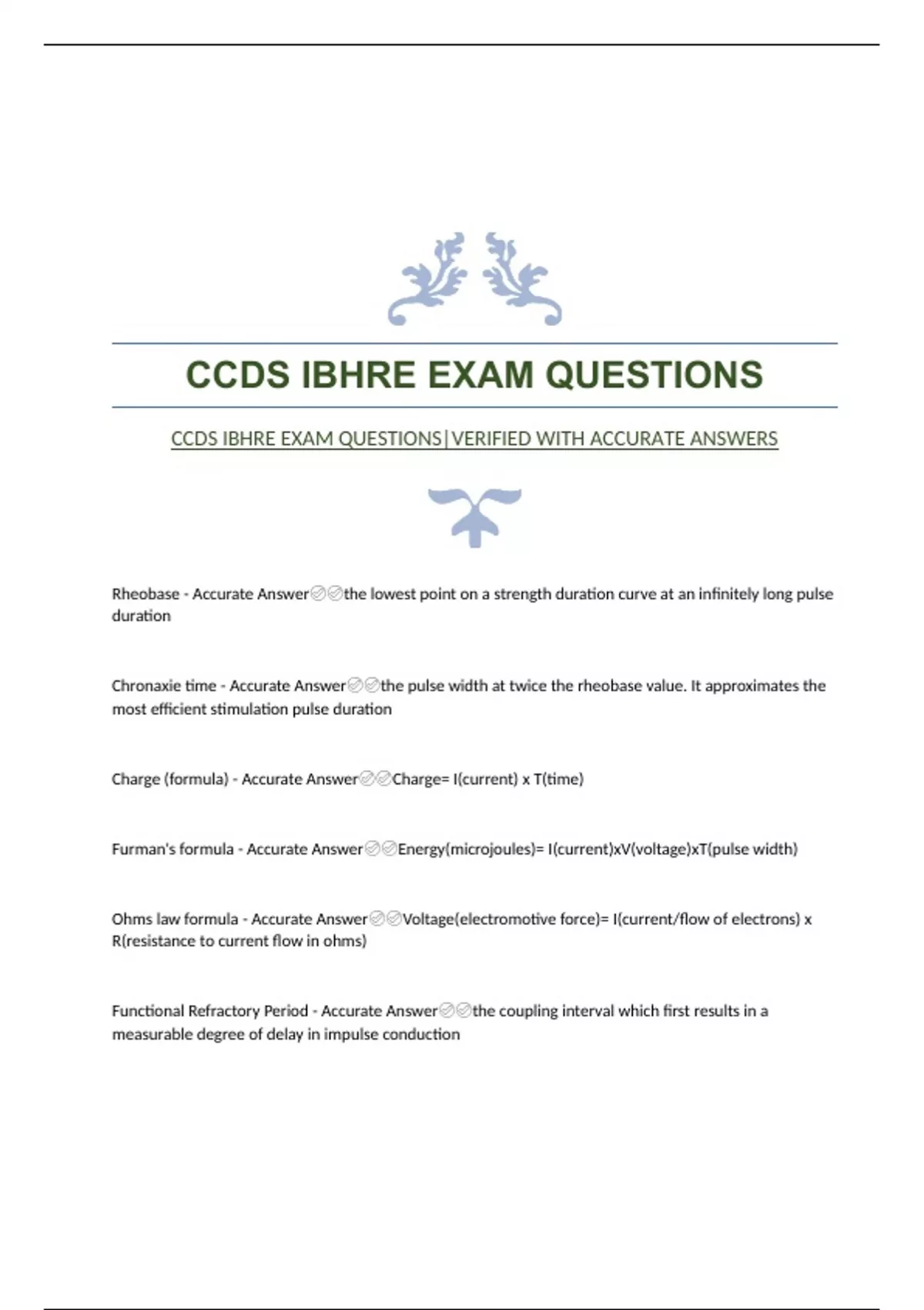 CCDS IBHRE EXAM QUESTIONS CCDS IBHRE EXAM QUESTIONS|VERIFIED WITH ACCURATE ANSWERS Rheobase - Accurate Answerthe lowest point on a strength duration curve at an infinitely long pulse duration Chronaxie time - Accurate Answerthe pulse width at twice the rheobase value. It approximates the most efficient stimulation pulse duration Charge (formula) - Accurate AnswerCharge= I(current) x T(time) Furman's formula - Accurate AnswerEnergy(microjoules)= I(current)xV(voltage)xT(pulse width) Ohms law formula - Accurate AnswerVoltage(electromotive force)= I(current/flow of electrons) x R(resistance to current flow in ohms) Functional Refractory Period - Accurate Answerthe coupling interval which first results in a measurable degree of delay in impulse conduction Effective Refractory Pe