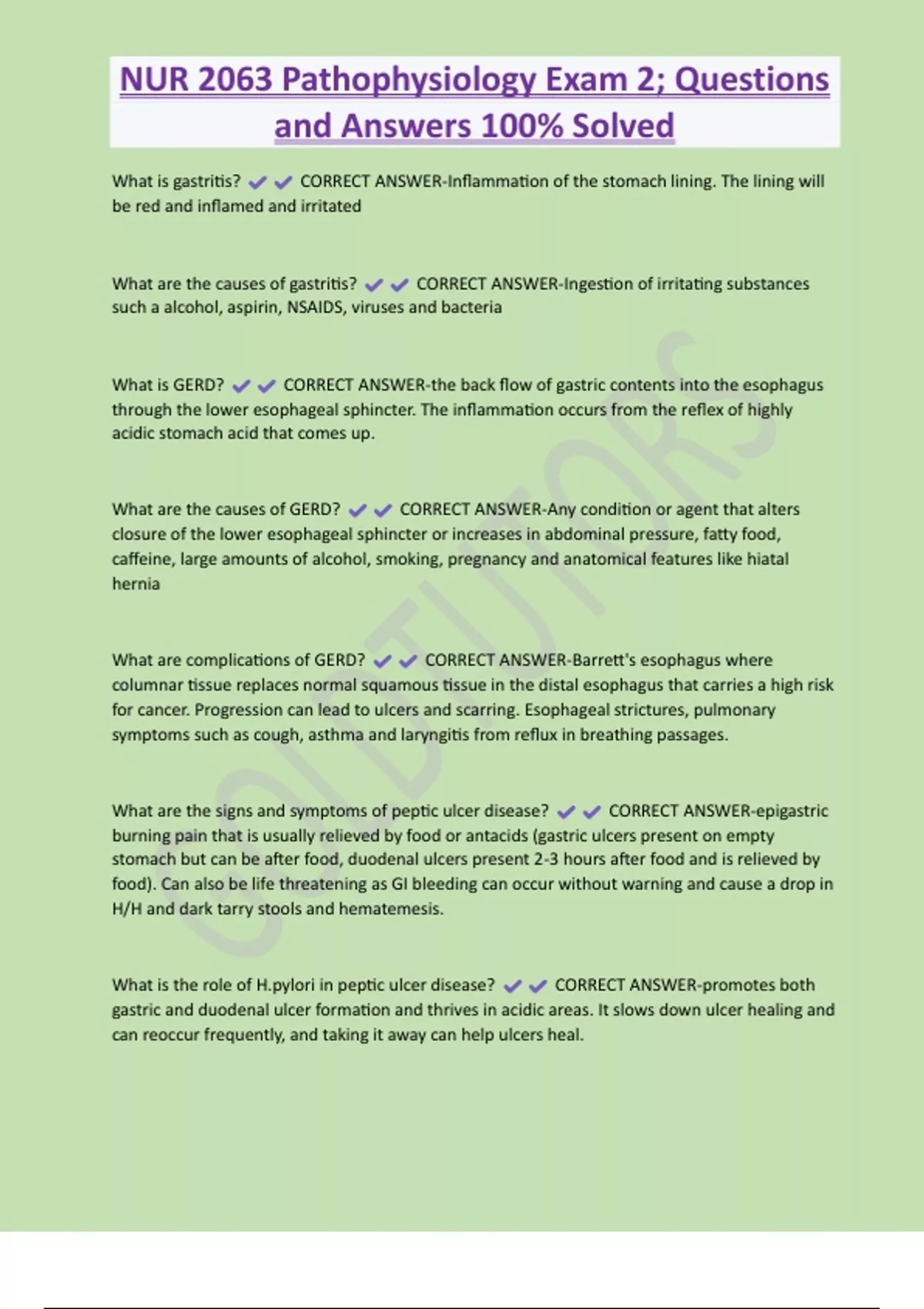 NUR 2063 Pathophysiology Exam 2; Questions and Answers 100% Solved What is gastritis? CORRECT ANSWER-Inflammation of the stomach lining. The lining will be red and inflamed and irritated What are the causes of gastritis? CORRECT ANSWER-Ingestion of irritating substances such a alcohol, aspirin, NSAIDS, viruses and bacteria What is GERD? CORRECT ANSWER-the back flow of gastric contents into the esophagus through the lower esophageal sphincter. The inflammation occurs from the reflex of highly acidic stomach acid that comes up.