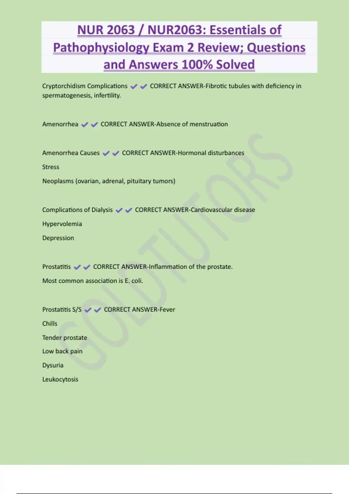 NUR 2063 / NUR2063: Essentials of Pathophysiology Exam 2 Review; Questions and Answers 100% Solved Cryptorchidism Complications CORRECT ANSWER-Fibrotic tubules with deficiency in spermatogenesis, infertility. Amenorrhea CORRECT ANSWER-Absence of menstruation Amenorrhea Causes CORRECT ANSWER-Hormonal disturbances Stress Neoplasms (ovarian, adrenal, pituitary tumors) Complications of Dialysis CORRECT ANSWER-Cardiovascular disease Hypervolemia Depression Prostatitis CORRECT ANSWER-Inflammation of the prostate. Most common association is E. coli