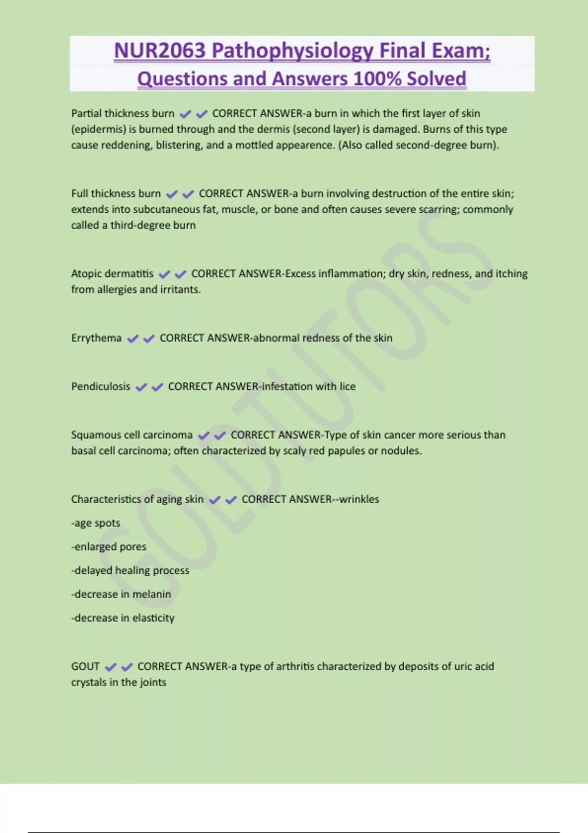 NUR2063 Pathophysiology Final Exam; Questions and Answers 100% Solved Partial thickness burn CORRECT ANSWER-a burn in which the first layer of skin (epidermis) is burned through and the dermis (second layer) is damaged. Burns of this type cause reddening, blistering, and a mottled appearence. (Also called second-degree burn). Full thickness burn CORRECT ANSWER-a burn involving destruction of the entire skin; extends into subcutaneous fat, muscle, or bone and often causes severe scarring; commonly called a third-degree burn