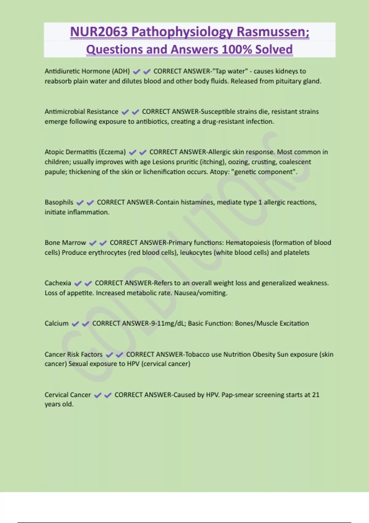 NUR2063 Pathophysiology Rasmussen; Questions and Answers 100% Solved Antidiuretic Hormone (ADH) CORRECT ANSWER-"Tap water" - causes kidneys to reabsorb plain water and dilutes blood and other body fluids. Released from pituitary gland. Antimicrobial Resistance CORRECT ANSWER-Susceptible strains die, resistant strains emerge following exposure to antibiotics, creating a drug-resistant infection. Atopic Dermatitis (Eczema) CORRECT ANSWER-Allergic skin response. Most common in children; usually improves with age Lesions pruritic (itching), oozing, crusting, coalescent papule; thickening of the skin or lichenification occurs. Atopy: "genetic component