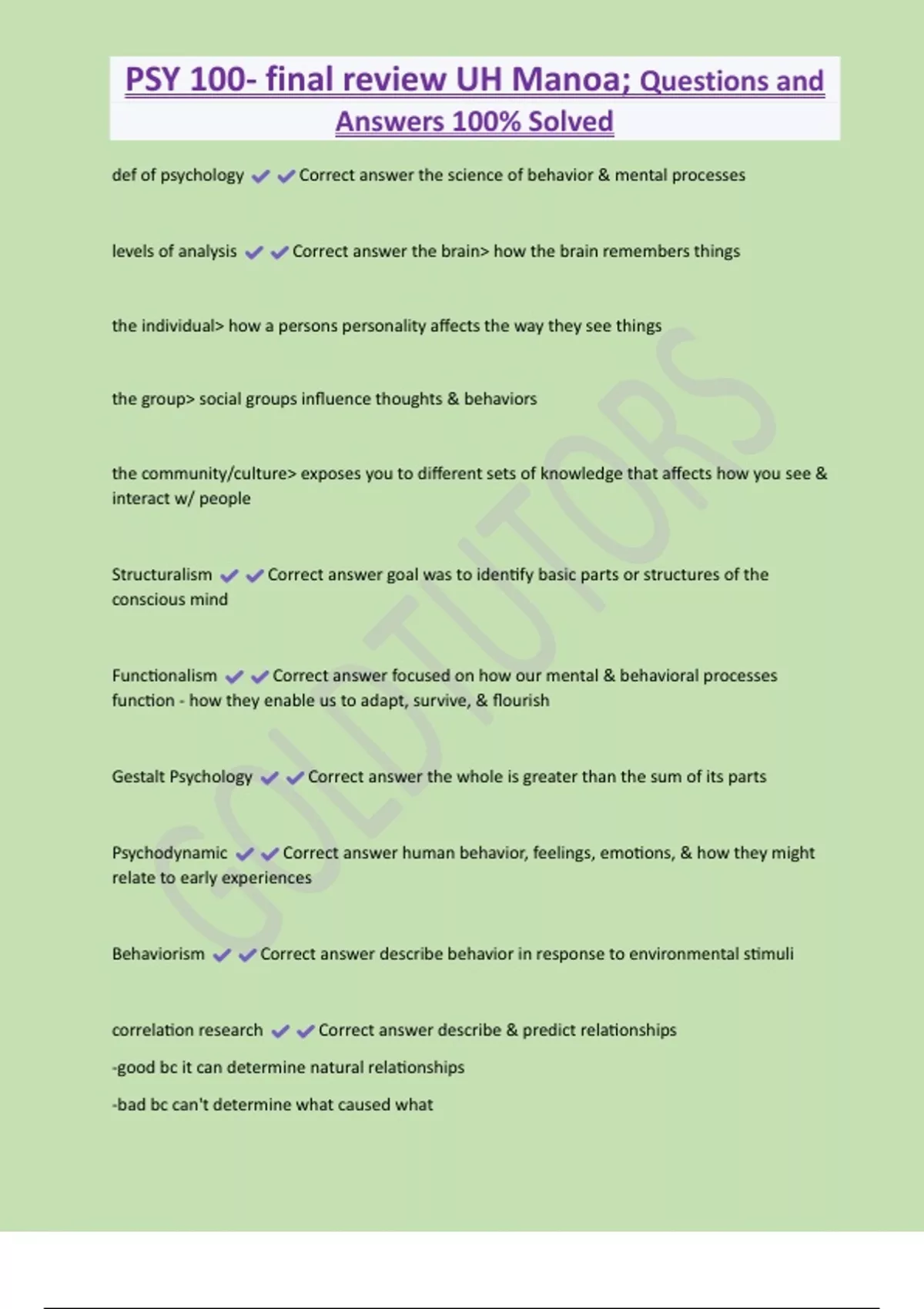 PSY 100- final review UH Manoa; Questions and Answers 100% Solved def of psychology Correct answer the science of behavior & mental processes levels of analysis Correct answer the brain> how the brain remembers things the individual> how a persons personality affects the way they see things the group> social groups influence thoughts & behaviors the community/cu