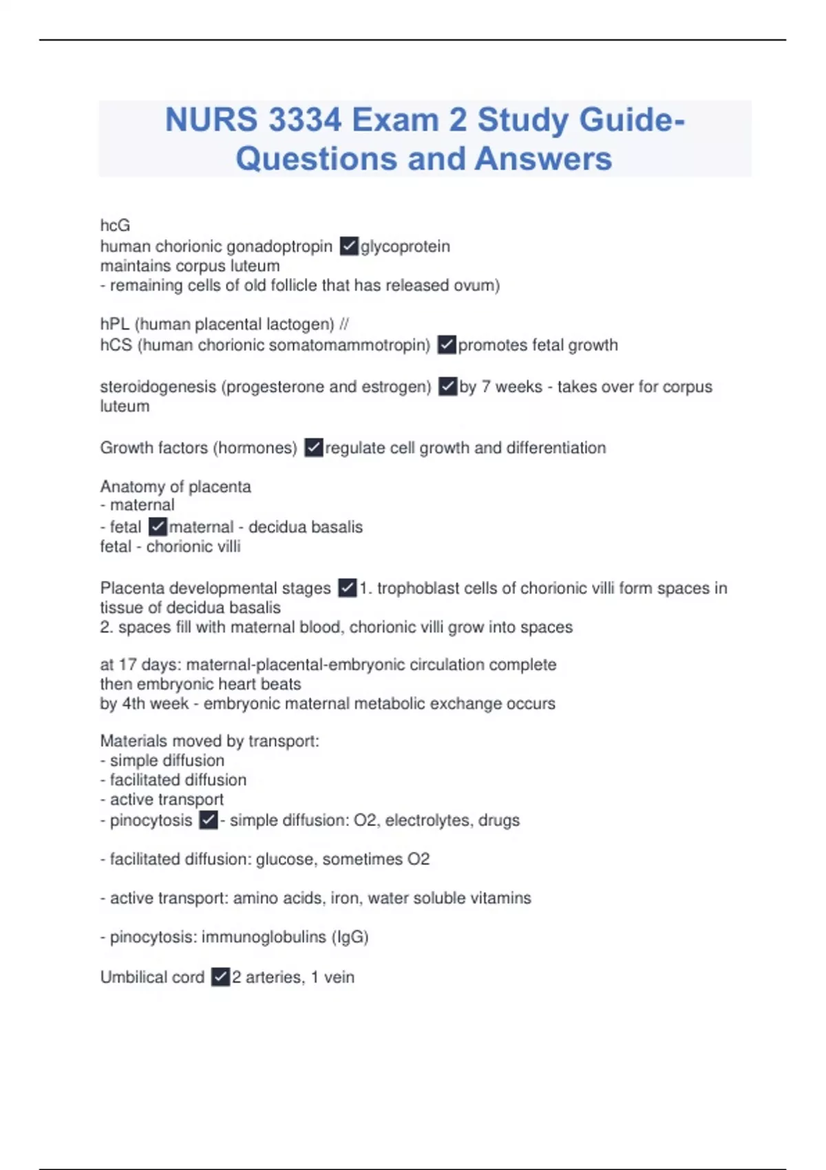 hcG human chorionic gonadoptropin glycoprotein maintains corpus luteum - remaining cells of old follicle that has released ovum) hPL (human placental lactogen) // hCS (human chorionic somatomammotropin) promotes fetal growth steroidogenesis (progesterone and estrogen) by 7 weeks - takes over for corpus luteum Growth factors (hormones) regulate cell growth and differentiation Anatomy of placenta - maternal - fetal maternal - decidua basalis fetal - chorionic villi Placenta developmental stages 1. trophoblast cells of chorionic villi form spaces in tissue of decidua basalis 2. spaces fill with maternal blood, chorionic villi grow into spaces at 17 days: maternal-placental-embryonic circulation complete then embryonic heart beats by 4th week - embryonic maternal metabolic exchange occurs Materials moved by transport: - simple diffusion - facilitated diffusion - active transport - pinocytosis - simple diffusion: O2, electrolytes, drugs - facilitated diffusion: glucose, sometimes O2 - active transport: amino acids, iron, water soluble vitamins - pinocytosis: immunoglobulins (IgG) Umbilical cord 2 arteries, 1 vein 4 vessels: - one vein atrophies by 6 weeks - occasionally one artery also atrophies (=2 vessel cord, anomalies) develops from amnion, connective tissue surrounds blood vessels = wharton's jelly Umbilical cord Wharton's Jelly collagen, muscle, mucopolysaccharides helps protect vessel from compression Placental Fetal Blood Flow / Exchange Blood flow: 500 mL/min Exchange: - Deoxygenated fetal blood through 2 umbilical arteries to capillaries of villi - Then O2 rich blood flows back through umbilical vein to fetus Maternal and fetal circulation separated Separated by layers of tissue called: "placental membrane" or "placental barrier" Embryonic membranes able to stretch and resist rupture as fetus grows - protects and supports fetus as it grows - amnion - chorion Amnion interior, thin, friable - passively pushed against thicker chorion - can rupture causing shreds - may wrap around and amputate fetal parts - space between amniotic membrane and embryo is amniotic cavity Chorion thicker, tough, continuous with chorionic plate, forms base of placenta Amniotic fluid volume gradually increases 98% H2O - fetal urine major source last half pregnancy volume gradually increases - 7 mL at 8 weeks - 800 mL at term - peaks at approx 1000 mL 2 weeks before delivery Amniotic fluid usefulness allows symmetric fetal growth constant temp/pressure cushion fetus