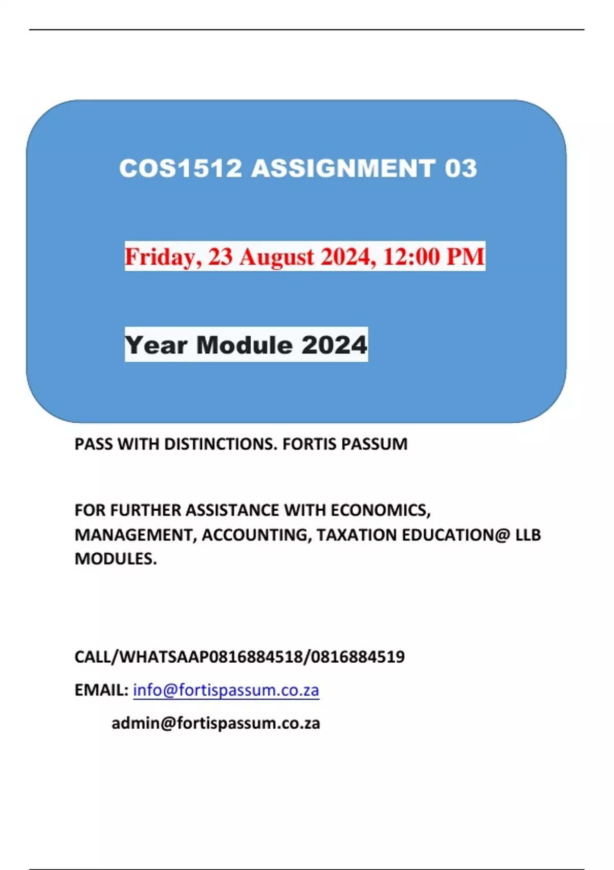 COS1512 ASSIGNMENT 03. DUE 23 AUGUST 2024. PASS WITH DISTINCTION-FORTIS PASSUM.