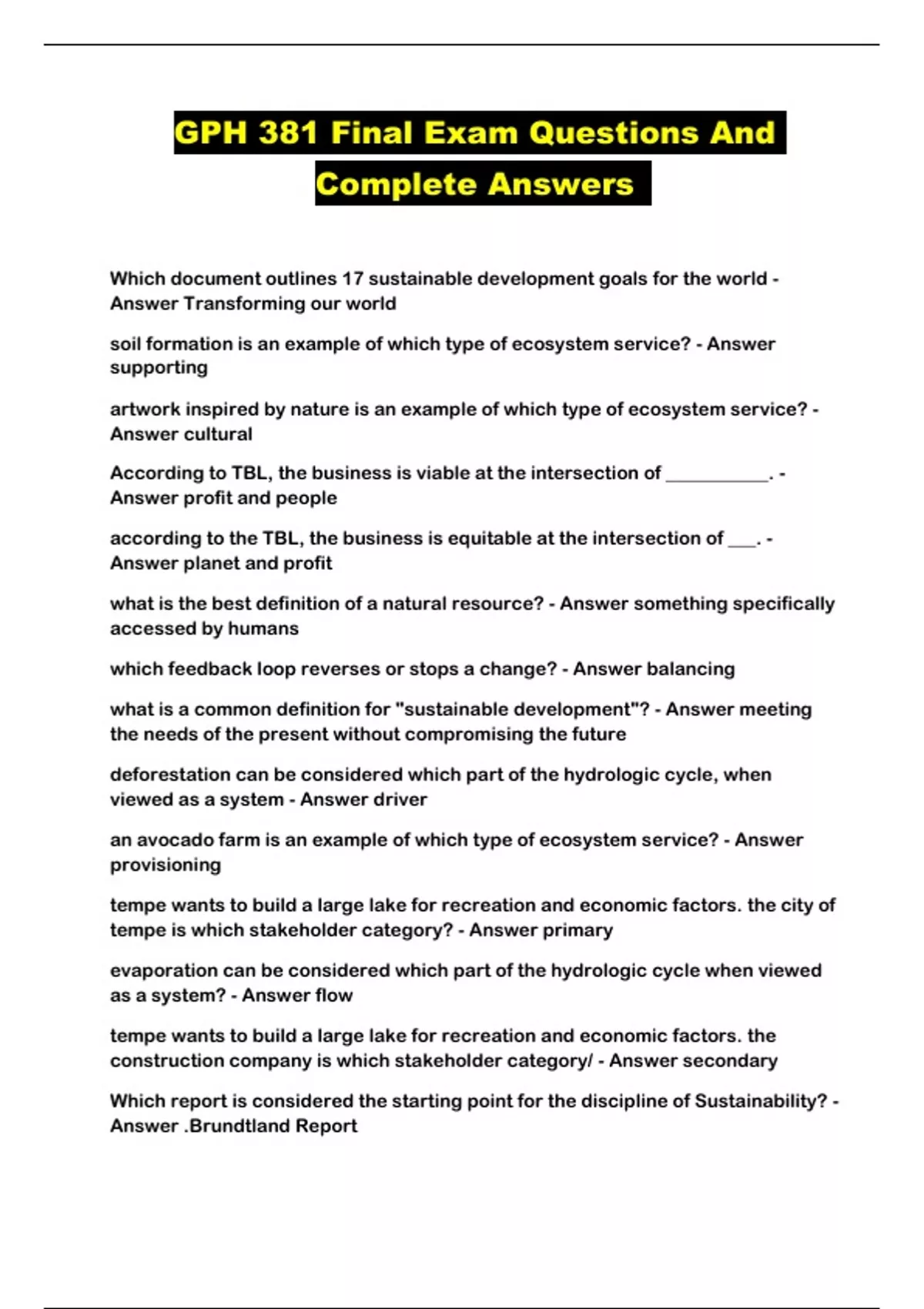 GPH 381 Final Exam Questions And Complete Answers