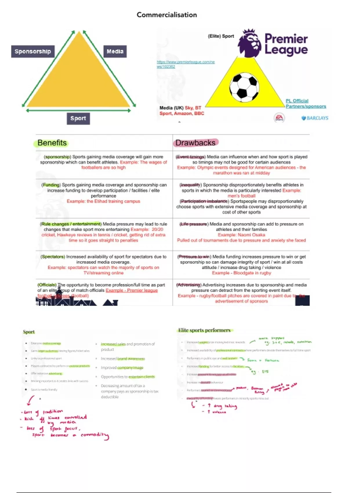 Summary Commercialisation benefits and drawbacks - AQA A level PE