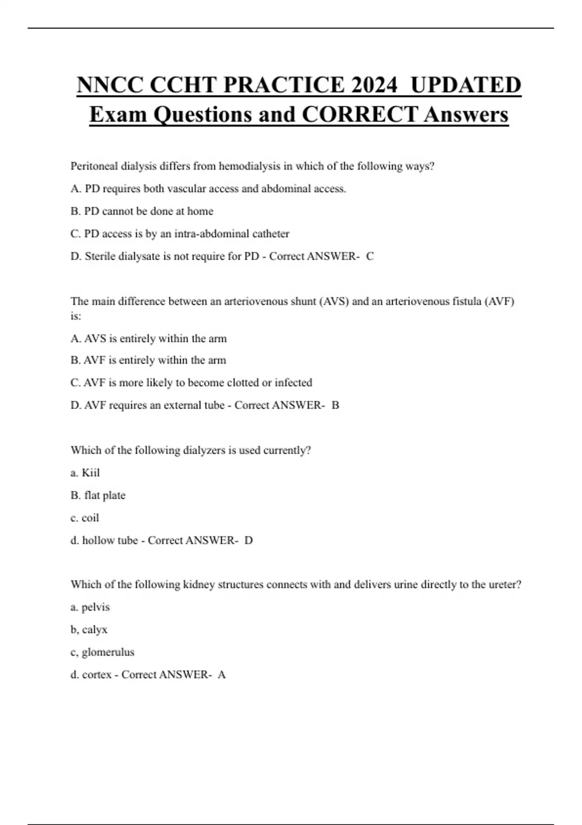 NNCC CCHT PRACTICE 2024 UPDATED Exam Questions and CORRECT Answers Peritoneal dialysis differs from hemodialysis in which of the following ways? A. PD requires both vascular access and abdominal access. B. PD cannot be done at home C. PD access is by an intra-abdominal catheter D. Sterile dialysate is not require for PD - Correct ANSWER- C The main difference between an arteriovenous shunt (AVS) and an arteriovenous fistula (AVF) is: A. AVS is entirely within the arm B. AVF is entirely within the arm C. AVF is more likely to become clotted or infected D. AVF requires an external tube - Correct ANSWER- B