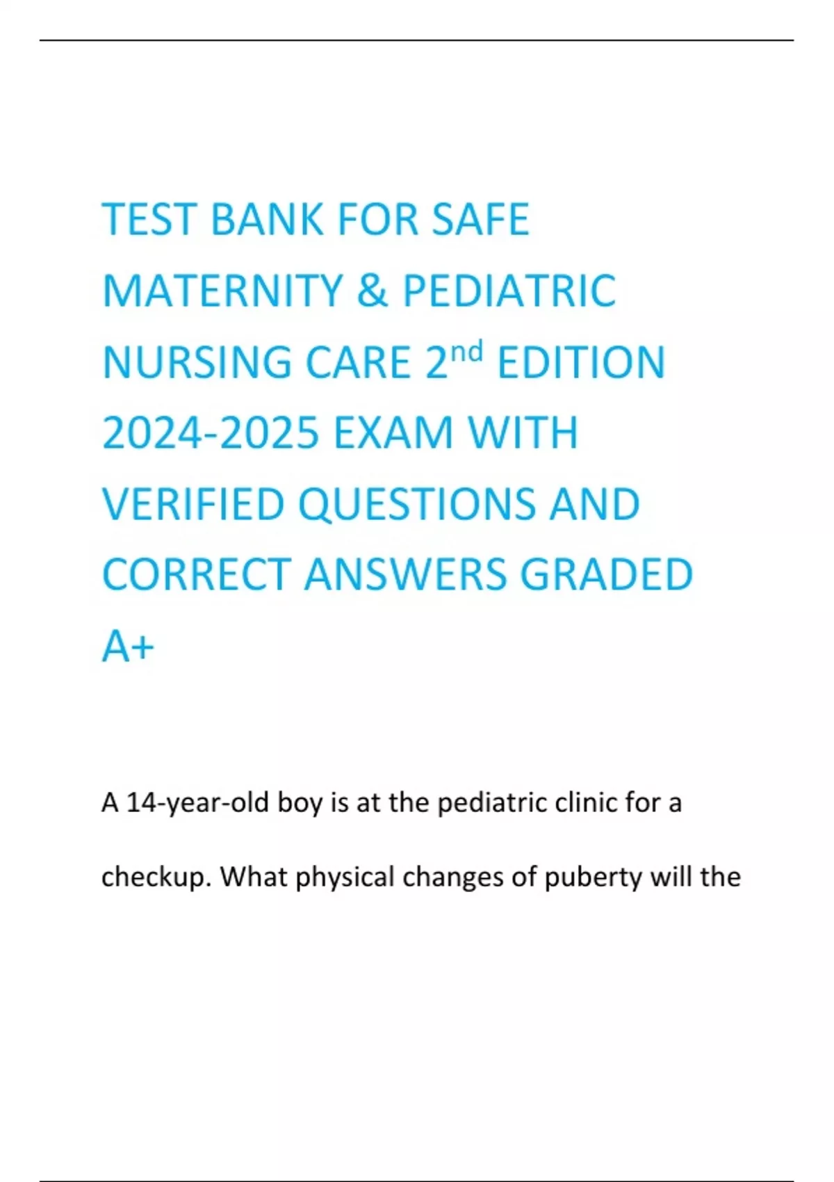 TEST BANK FOR SAFE MATERNITY & PEDIATRIC NURSING CARE 2 nd EDITION EXAM WITH VERIFIED QUESTIONS AND CORRECT ANSWERS GRADED A+