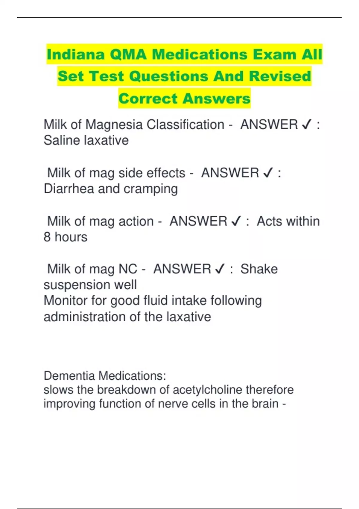 Indiana QMA Medications Exam All Set Test Questions And Revised Correct Answers Milk of Magnesia Classification - ANSWER : Saline laxative Milk of mag side effects - ANSWER : Diarrhea and cramping Milk of mag action - ANSWER : Acts within 8 hours Milk of mag NC - ANSWER : Shake suspension well Monitor for good fluid intake following administration of the laxative Dementia Medications: slows the breakdown of acetylcholine therefore improving function of nerve cells in the brain - ANSWER : To treat mild to moderate type Dementias. donepezil (Aricept), rivastigmine (Exelon), galantamine (Reminyl) SE: GI upsets, dizziness, headache, fatigue Tricyclic Antidepressants: increases norepinephrine, serotonin or both in the CNA *Avoid sun exposure, may take up to 4 weeks to take affect - ANSWER : To treat depression. amitriptyline HCL (Elavil), nortriptyline HCL (Pamelor, Aventyl), paroxetine HCL (Paxil), sertraline HCL (Zoloft), fluoxetine HCL (Prozac), escitalopram (Lexapro) SE: seizures, heart irregularities, constipation, urinary retention, diarrhea