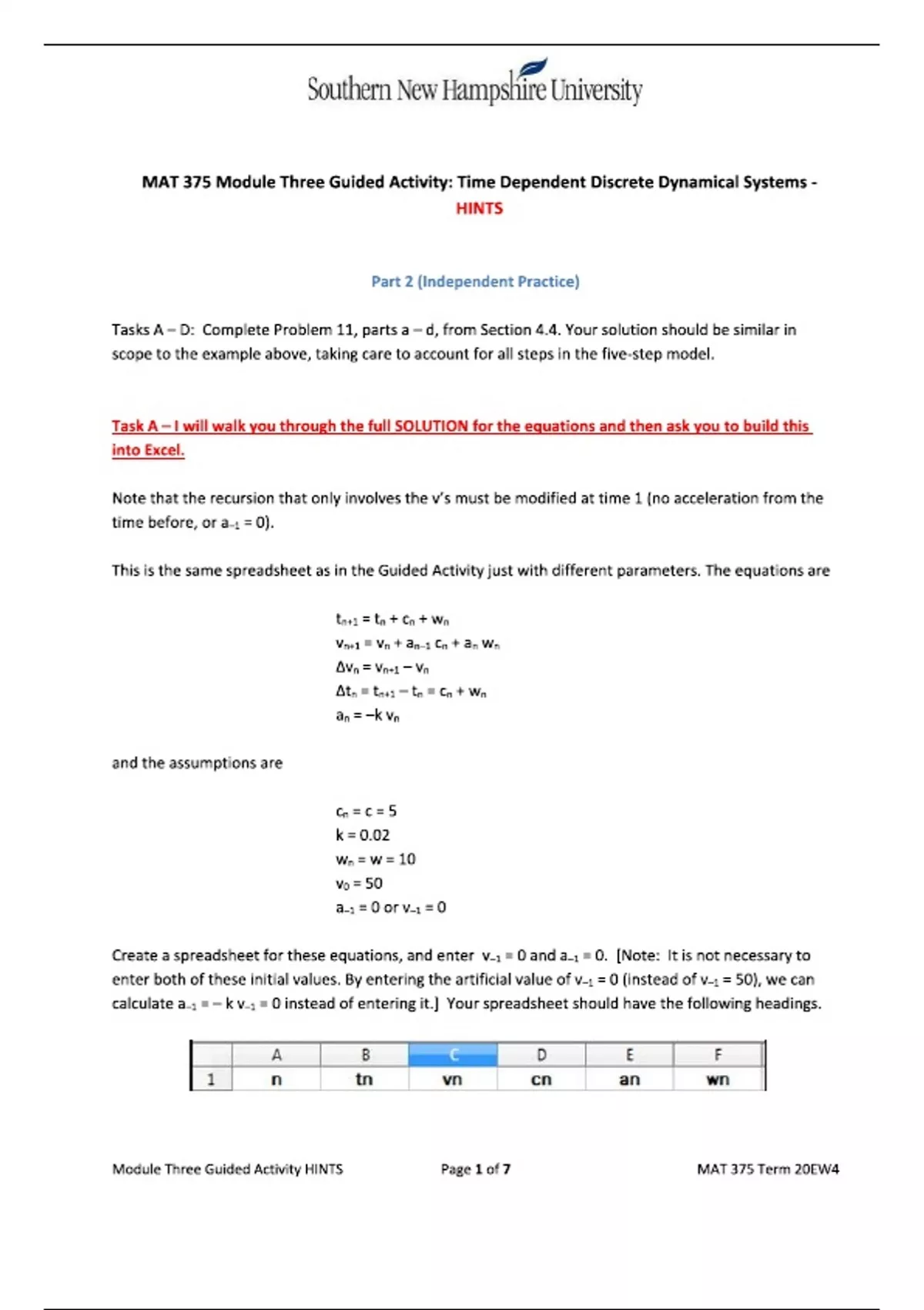 MAT 375 Module Three Guided Activity Time Dependent Discrete Dynamical Systems - HINTS Part 2 (Independent Practice) with complete solution | verified | latest update 2024
