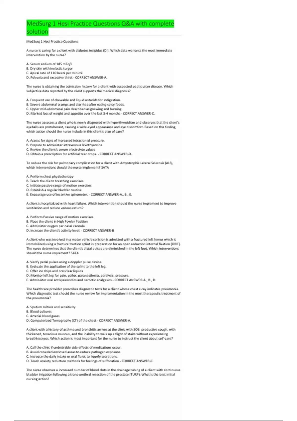 MedSurg 1 Hesi Practice Questions Q&A with complete solution