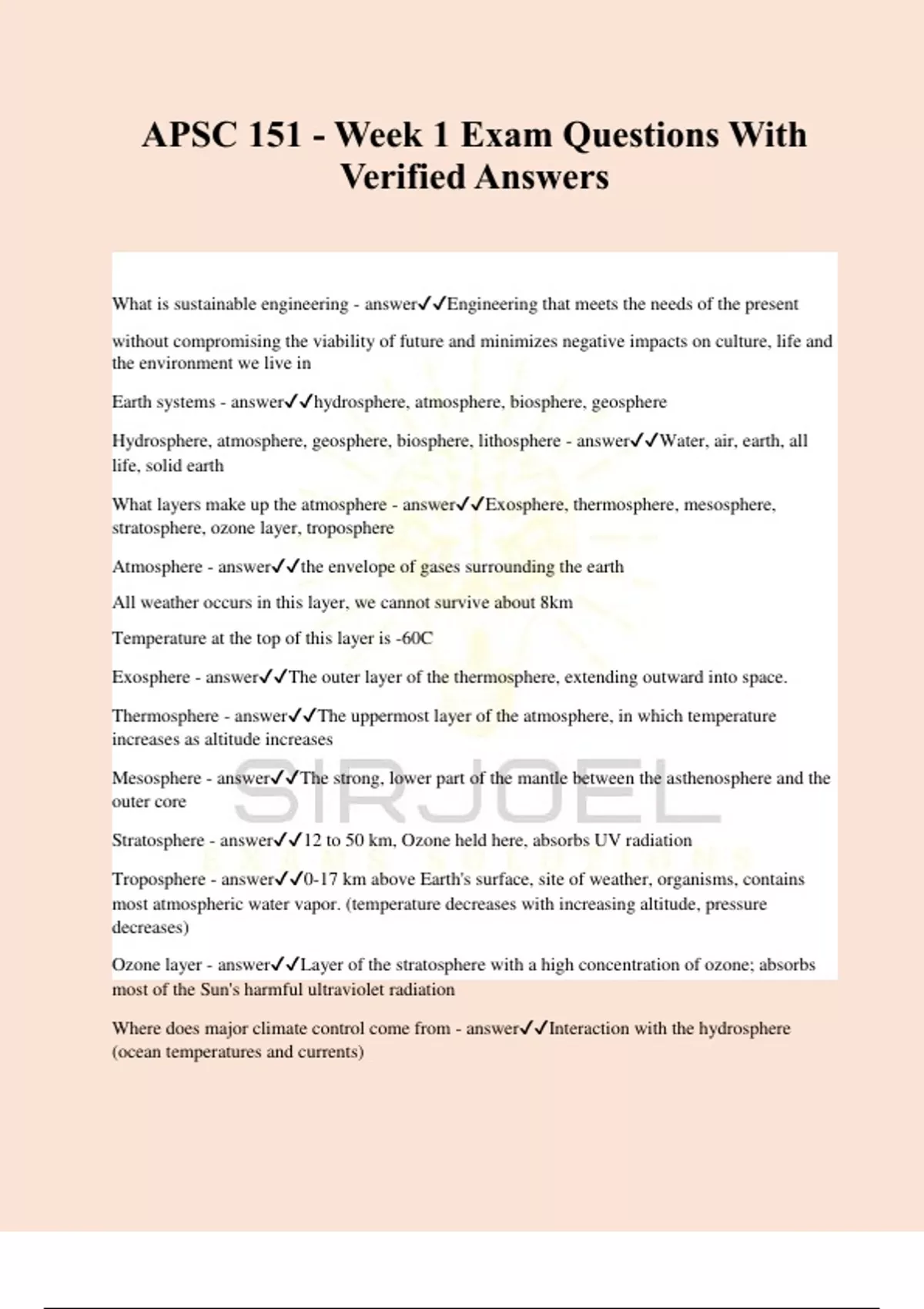 APSC 151 - Week 1 Exam Questions With Verified Answers What is sustainable engineering - answerEngineering that meets the needs of the present without compromising the viability of future and minimizes negative impacts on culture, life and the environment we live in Earth systems - answerhydrosphere, atmosphere, biosphere, geosphere Hydrosphere, atmosphere, geosphere, biosphere, lithosphere - answerWater, air, earth, all life, solid earth What layers make up the atmosphere - answerExosphere, thermosphere, mesosphere, stratosphere, ozone layer, troposphere Atmosphere - answerthe envelope of gases surrounding the earth All weather occurs in this layer, we cannot survive about 8km Temperature at the top of this layer is -60C Exosphere - answerThe outer layer of the thermosphere, extending outward into space. Thermosphere - answerThe uppermost layer of the atmosphere, in which temperature increases as altitude increases Mesosphere - answerThe strong, lower part of the mantle between the asthenosphere and the outer core Stratosphere - answer12 to 50 km, Ozone held here, absorbs UV radiation Troposphere - answer0-17 km above Earth's surface, site of weather, organisms, contains most atmospheric water vapor. (temperature decreases with increasing altitude, pressure decreases) Ozone layer - answerLayer of the stratosphere with a high concentration of ozone; absorbs most of the Sun's harmful ultraviolet radiation Where does major climate control come from - answerInteraction with the hydrosphere (ocean temperatures and currents)
