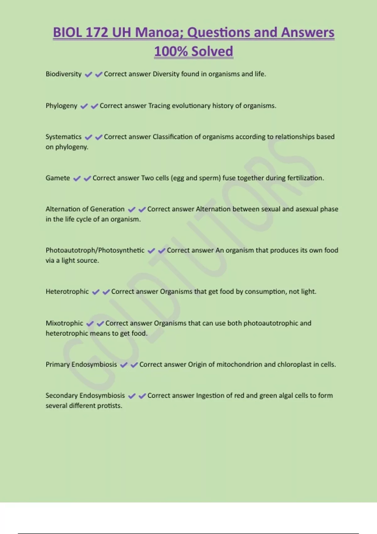 BIOL 172 UH Manoa; Questions and Answers 100% Solved