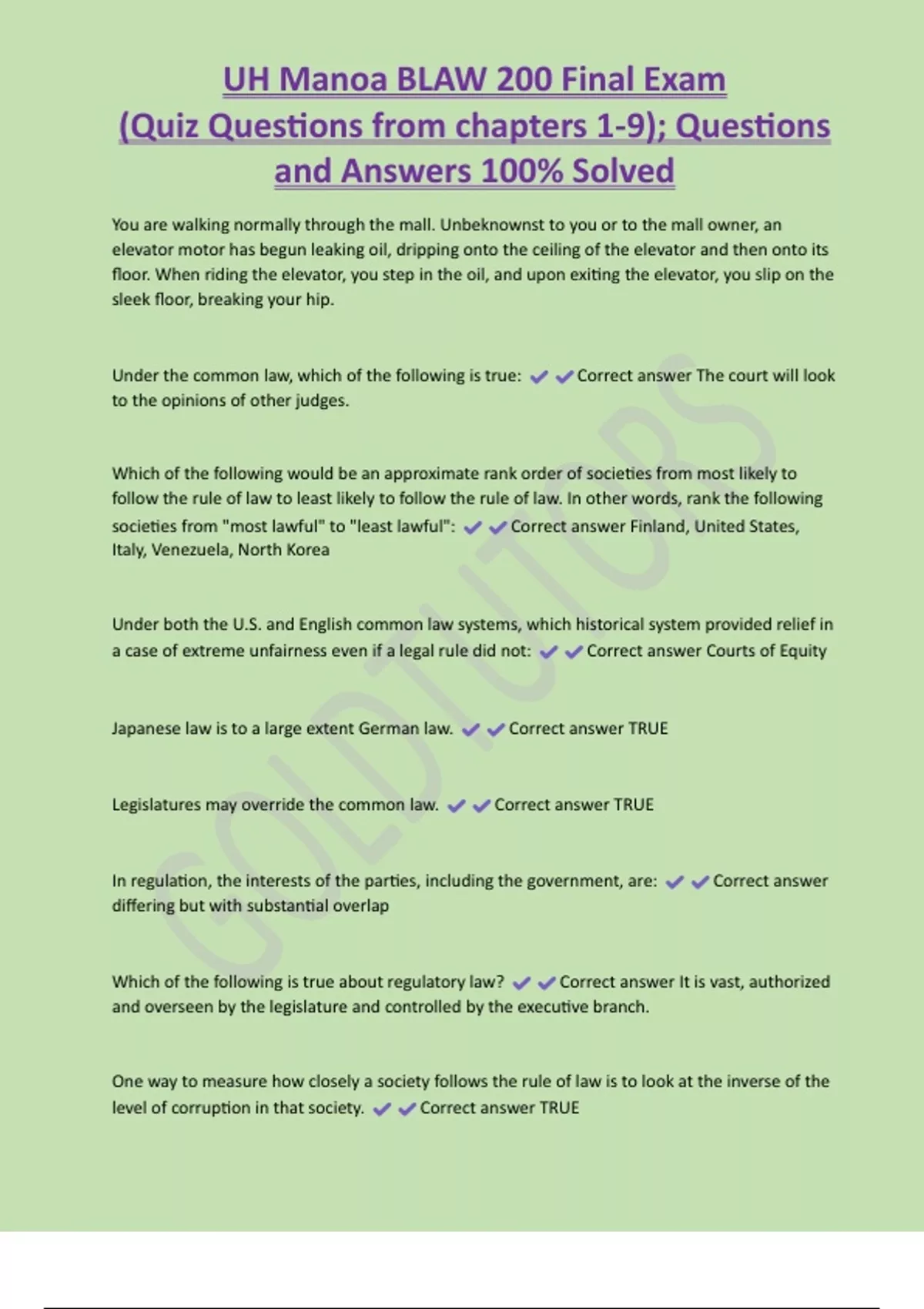 UH Manoa BLAW 200 Final Exam (Quiz Questions from chapters 1-9); Questions and Answers 100% Solved You are walking normally through the mall. Unbeknownst to you or to the mall owner, an elevator motor has begun leaking oil, dripping onto the ceiling of the elevator and then onto its floor. When riding the elevator, you step in the oil, and upon exiting the elevator, you slip on the sleek floor, breaking your hip. Under the common law, which of the following is true: Correct answer The court will look to the opinions of other judges. Which of the following would be an approximate rank order of societies from most likely to follow the rule of law to least likely to follow the rule of law. In other words, rank the following societies from "most lawful" to "least lawful": Correct answer Finland, United States, Italy, Venezuela, North Korea