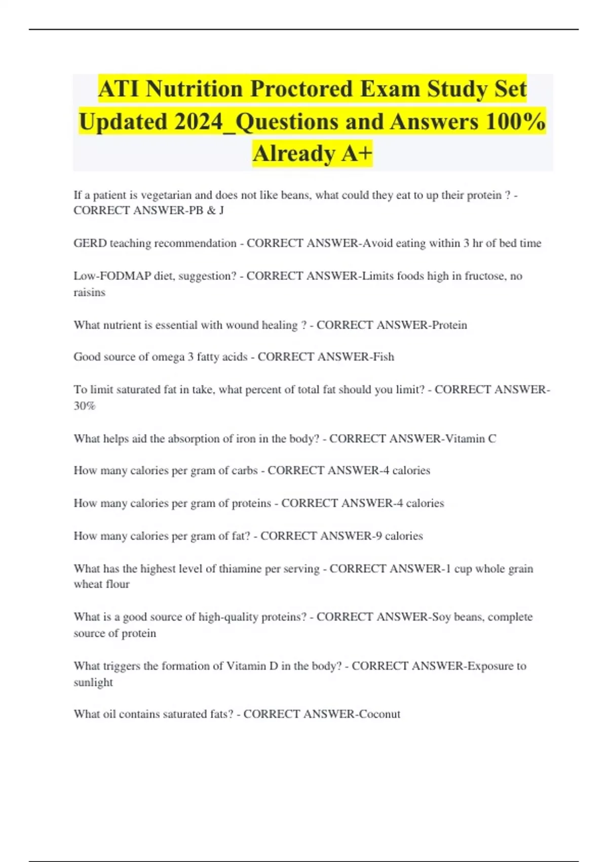 ATI Nutrition Proctored Exam Study Set Updated 2024_Questions and Answers 100% Already A+ If a patient is vegetarian and does not like beans, what could they eat to up their protein ? - CORRECT ANSWER-PB & J GERD teaching recommendation - CORRECT ANSWER-Avoid eating within 3 hr of bed time Low-FODMAP diet, suggestion? - CORRECT ANSWER-Limits foods high in fructose, no raisins What nutrient is essential with wound healing ? - CORRECT ANSWER-Protein Good source of omega 3 fatty acids - CORRECT ANSWER-Fish To limit saturated fat in take, what percent of total fat should you limit? - CORRECT ANSWER-30% What helps aid the absorption of iron in the body? - CORRECT ANSWER-Vitamin C How many calories per gram of carbs - CORRECT ANSWER-4 calories How many calories per gram of proteins - CORRECT ANSWER-4 calories How many calories per gram of fat? - CORRECT ANSWER-9 calories What has the highest level of thiamine per serving - CORRECT ANSWER-1 cup whole grain wheat flour What is a good source of high-quality proteins? - CORRECT ANSWER-Soy beans, complete source of protein What triggers the formation of Vitamin D in the body? - CORRECT ANSWER-Exposure to sunlight What oil contains saturated fats? - CORRECT ANSWER-Coconut Appropriate daily intake of fiber for adult women - CORRECT ANSWER-20-35 g Recommended amount of veggies/day - CORRECT ANSWER-2.5 cups Teaching for frequent kidney stones - CORRECT ANSWER-Avoid tree nuts Patient with neuropathy secondary to DM, what dietary adjustment would help? - CORRECT ANSWER-consuming less than 0.8 g/kg protein What sweetener adds calories to clients carb count? - CORRECT ANSWER-Sorbitol What food to avoid with dumping syndrome? - CORRECT ANSWER-Fresh apples What indicates follow up teaching is needed with low cholesterol diet? - CORRECT ANSWER-2 eggs for breakfast What lab values indicates TPN is effective? - CORRECT ANSWER-Albumin 4.2 Dietary teaching wit calcium oxalate kidney stones, what indicates good understanding? - CORRECT ANSWER-I may eat a banana with my breakfast A pt. has HTN with mediterranean diet, what indicates the need for more teaching? - CORRECT ANSWER-I will limit my intake of red meat to 2x weekly What is the equivalent of 6 tsp of oil? - CORRECT ANSWER-1 oz sunflower seeds What can dehydration cause? - CORRECT ANSWER-Impaired motor control What indicates a need for further teaching about formula feeding? - CORRECT ANSWER-I will ensure my babys feedings last 10-15 min Appropriate snack for toddler - CORRECT ANSWER-Sliced bananas When can a infant drink whole milk? - CORRECT ANSWER-12 months What are good sources of vitamin C - CORRECT ANSWER-Green pepper, orange, cabbage, strawberries What enhances iron absorption when consumed with nonheme iron? - CORRECT ANSWER-Tomato juice After 2nd trimester, how much calories need to be increased? - CORRECT ANSWER-340/day What is a reliable source of vitamin B12? - CORRECT ANSWER-Sunflower margarine What should you avoid with a low potassium diet? - CORRECT ANSWER-Yogurt, orange juice What could you eat with a low fiber diet? - CORRECT ANSWER-White rice Which of the following food choices should a history of pancreatitis avoid? - CORRECT ANSWER-Cheddar cheese or high fat meals What should you include with cirrhosis and ascites? - CORRECT ANSWER-Lower fluid intake What advice should you give for a client with chronic pancreatitis? - CORRECT ANSWER-You should increase your daily intake of protein Sweetener for T1 DM - CORRECT ANSWER-Nonnutritive sugar sub What diet source should provide greatest percent of calories in diabetes? - CORRECT ANSWER-Complex carbs Low purine diets should avoid what? - CORRECT ANSWER-Liver & organ meats What could help decrease gas with an ostomy? - CORRECT ANSWER-Eating yogurt What diet helps establish bowel regularity? - CORRECT ANSWER-High fiber What should you avoid when doing chemo? - CORRECT ANSWER-Drinking liquids an hour before Acute pancreatitis & fat soluble vitamin supplements, what supplement should the Pt. take? - CORRECT ANSWER-Vitamin A What should you teach a client who has neutropenia due to radiation for lung cancer? - CORRECT ANSWER-Bottled water is an appropriate choice to increase fluid intake