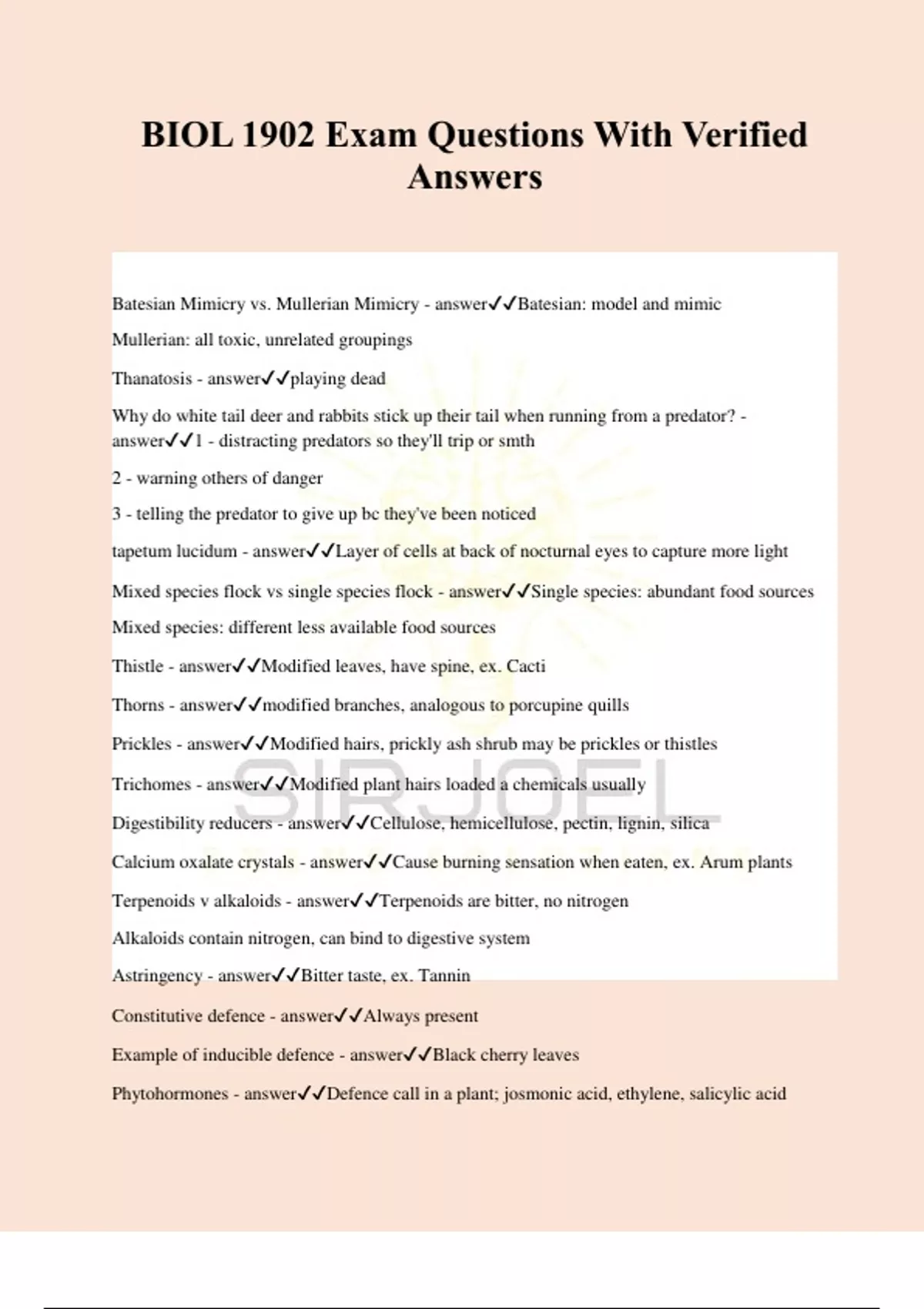 BIOL 1902 Exam Questions With Verified Answers Batesian Mimicry vs. Mullerian Mimicry - answerBatesian: model and mimic Mullerian: all toxic, unrelated groupings Thanatosis - answerplaying dead Why do white tail deer and rabbits stick up their tail when running from a predator? - answer1 - distracting predators so they'll trip or smth 2 - warning others of danger 3 - telling the predator to give up bc they've been noticed tapetum lucidum - answerLayer of cells at back of nocturnal eyes to capture more light Mixed species flock vs single species flock - answerSingle species: abundant food sources Mixed species: different less available food sources Thistle - answerModified leaves, have spine, ex. Cacti Thorns - answermodified branches, analogous to porcupine quills Prickles - answerModified hairs, prickly ash shrub may be prickles or thistles Trichomes - answerModified plant hairs loaded a chemicals usually Digestibility reducers - answerCellulose, hemicellulose, pectin, lignin, silica Calcium oxalate crystals - answerCause burning sensation when eaten, ex. Arum plants Terpenoids v alkaloids - answerTerpenoids are bitter, no nitrogen Alkaloids contain nitrogen, can bind to digestive system Astringency - answerBitter taste, ex. Tannin Constitutive defence - answerAlways present Example of inducible defence - answerBlack cherry leaves Phytohormones - answerDefence call in a plant; josmonic acid, ethylene, salicylic acid Mammal thermogenesis and insulation layers - answerGuard hair;underfur;subcutaneous fat;brown fat Bird insulations and thermogenesis layers - answerContour feathers;down;subcutaneous fat Gloger's Rule - answerWhite animals are more common in cold climates/north of the equator Allen's rule - answerSmall extremities + big bod = best heat retention Bergmann's Rule - answerThe principle that an animal's size is heat-related; smaller bodies are adapted to hot environments, and larger bodies are adapted to cold environments. AKA low surface area: volume ratio is best (polar bears not a shrew) (100:90 is better than 1000:50) Best winter bird roost site - answerConiferous trees (retain needles) w snow What animals, beside woodpeckers, sleep in tree cavities? - answerSmall owls, black capped chickadees, huddles of flying squirrels and raccoons respectively Where does the ruffled grouse sleep in winter - answerSnow bed Who basks awake and who basks asleep - answerBoreal owl: asleep Ruffled grouse: awake torpor - answerDeep sleep that conserves heat but wake up throughout winter; black cap chickadees wake up at 12C to shiver; chipmunks Lethargy - answerLow body temp and heart rate goes to deep sleep; awaken on warm days (raccoons, skunks, porcupines) Hibernation - answerLong term torpor, only wake up once or twice to heat up; groundhog, jumping mice hibernaculum v. Subnivean space - answerSubnivean: between the ground and the snow Hibernaculum: crevices below the frost line (snakes, reptiles) Glycerol - answerAnti-freeze, cryoprotectant, Supercooling v freeze tolerance - answerSupercooling: no freeze forms bc of antifreeze Freeze tolerance: ice nucleating sites encouraged by proteins, antifreeze inside cells toboggan - answerOtters sliding on their bellies Other than birds, who migrated? - answerMonarch butterflies, red bats, common green darter dragonflies