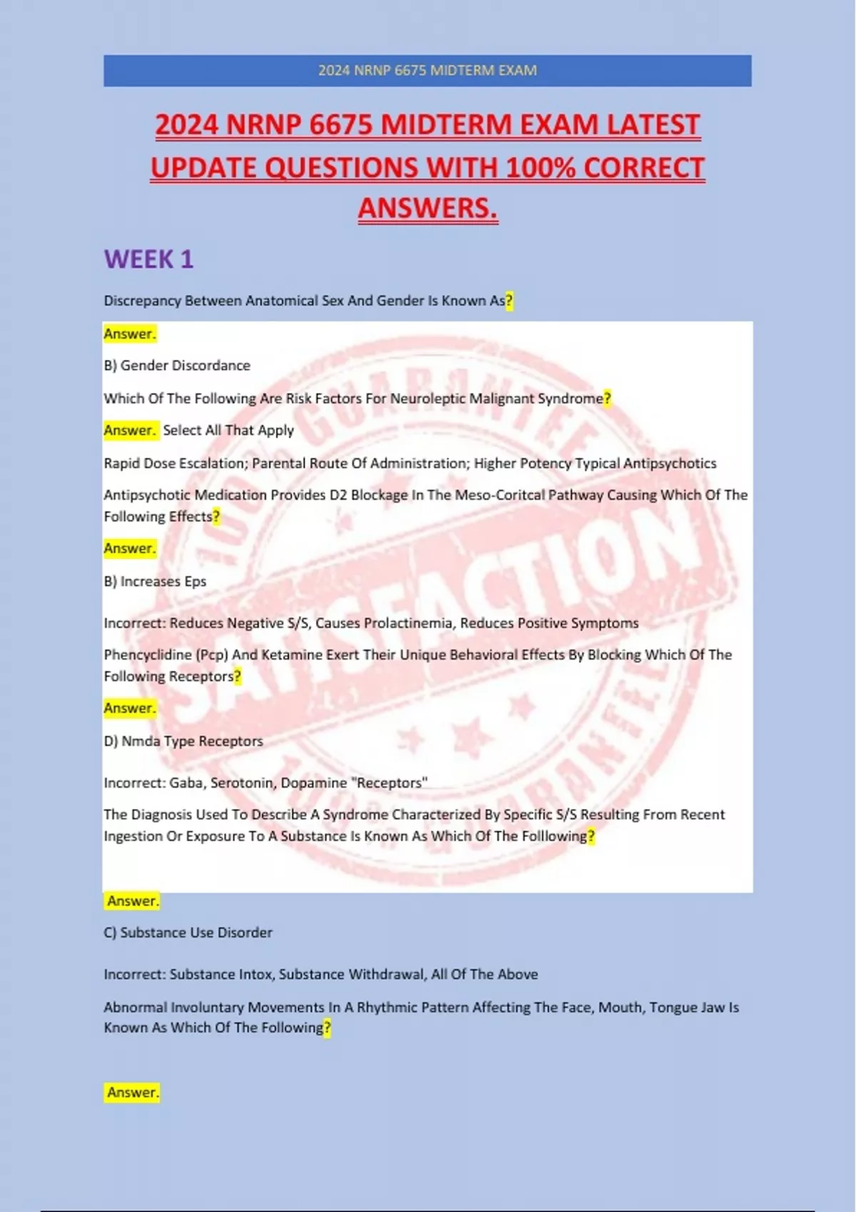 2024 NRNP 6675 MIDTERM EXAM LATEST UPDATE QUESTIONS WITH 100% CORRECT ANSWERS. 2024 NRNP 6675 MIDTERM EXAM LATEST UPDATE QUESTIONS WITH 100% CORRECT ANSWERS.