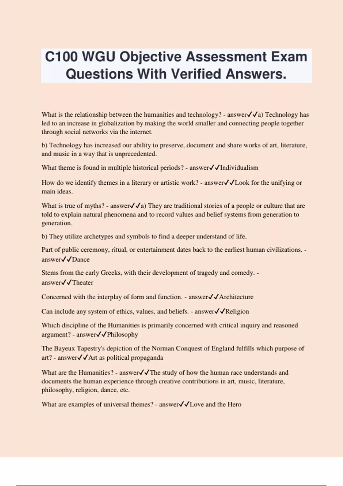 C100 WGU Objective Assessment Exam Questions With Verified Answers. What is the relationship between the humanities and technology? - answera) Technology has led to an increase in globalization by making the world smaller and connecting people together through social networks via the internet. b) Technology has increased our ability to preserve, document and share works of art, literature, and music in a way that is unprecedented. What theme is found in multiple historical periods? - answerIndividualism How do we identify themes in a literary or artistic work? - answerLook for the unifying or main ideas. What is true of myths? - answera) They are traditional stories of a people or culture that are told to explain natural phenomena and to record values and belief systems from generation to generation. b) They utilize archetypes and symbols to find a deeper understand of life. Part of public ceremony, ritual, or entertainment dates back to the earliest human civilizations. - answerDance Stems from the early Greeks, with their development of tragedy and comedy. - answerTheater Concerned with the interplay of form and function. - answerArchitecture Can include any system of ethics, values, and beliefs. - answerReligion Which discipline of the Humanities is primarily concerned with critical inquiry and reasoned argument? - answerPhilosophy The Bayeux Tapestry's depiction of the Norman Conquest of England fulfills which purpose of art? - answerArt as political propaganda What are the Humanities? - answerThe study of how the human race understands and documents the human experience through creative contributions in art, music, literature, philosophy, religion, dance, etc. What are examples of universal themes? - answerLove and the Hero Brotherly or selfless love - answerAgape A recurrent example or model of human behavior - answerArchetypes An experience of beauty that is its own justification - answerAesthetic Passionate or sexual love - answerEros A myth that is embraced by a majority of people throughout history. - answerMonomyth Why is E.O. Wilson's theory of consilience important to the study of the Humanities? - answerIt reinforces interdisciplinary study and facilitates the exchange of information necessary to create a more holistic understanding of who we are. How was Humanism reflected in the non-western world? - answerAncient Chinese culture embraced principles in Confucianism and Buddhism that mirrored Humanist principles. How does studying the Humanities increase cross-cultural communication? - answerIt helps us to interact with and understand a variety of people from different times and different places through their creative contributions. How does studying the portrayal of love over time enhance one's understanding of humanity? - answerThe study of love in all its form (eros, agape, and platonic love) illustrates a distinction in types of love that has captured the attention of artists. What is the difference between a myth and a monomyth? - answerMyths can include a wide variety of narratives and archetypes. The monomyth focuses on the hero's journey. Emphasized the themes of order and balance in its construction as a temple to the goddess Athena, patron of Athens. - answerThe Parthenon Applied reason and logical thought to ideas about government and how to live a good, balanced life. - answerThe Republic An epic poem narrating the story of an ideal Greek hero who combined all the greatest virtues of Greek culture, as well as showing his interaction with the Greek pantheon of gods. - answerThe Odyssey A story of a man who lives his life not knowing the truth of his parentage and whose pride ultimately causes him to ignore his flawed humanity, resulting in the ultimate punishment of blindness and exile. - answerOedipus Rex A play about heroic women who withhold sex from their husbands in order to end the Peloponnesian war and force a more democratic, egalitarian political climate. - answerLysistrata